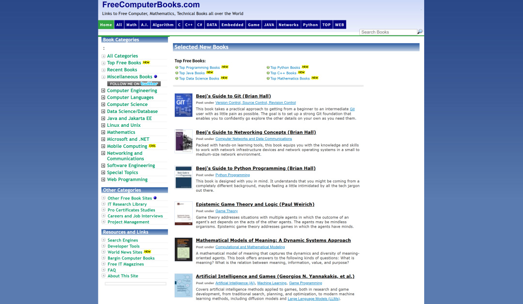 Free Computer Books 是一个专注于计算机领域的免费书籍资源站点,虽网站界面有年代感,但资源质量极高。平台收录的全部是与计算机相关的书籍,首页推荐书籍多为较新版本,例如 2019 年的「Introduction to C and GUI Programming」,该书籍源自树莓派提供的 C & GUI PROGRAMMING 教材,对于计算机专业学生来说,是获取专业教材与参考资料的优质平台。