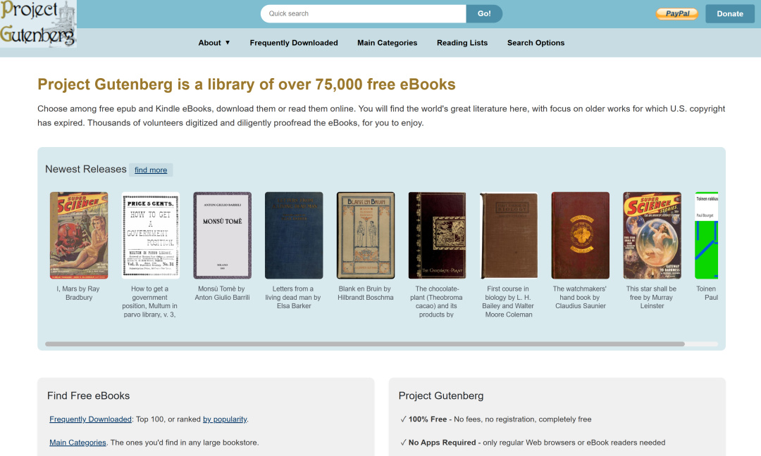 Project Gutenberg(古登堡计划)是全球首家且目前规模最大的公益性质数字电子图书馆,核心宗旨是以自由电子化形式提供版权过期的书籍。平台拥有多达 59000 本免费电子版书籍,其中包含大量经典教科书,虽因版权原因,收录内容相对过时,但胜在资源完全免费且数量庞大,对于需要经典教材参考的学生来说,仍是重要的资源获取渠道。