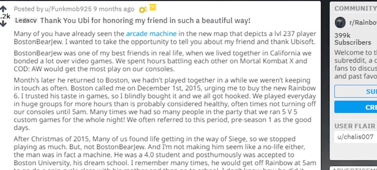 原来“BostonBearJew”是一位过世的《彩虹六号:围攻》玩家,“BostonBearJew”和他的好朋友一起住在加利福尼亚州,2005年时,在“BostonBearJew”的劝说下,他的朋友买了《彩虹六号:围攻》,然后大家一起游玩这个游戏,每天都成群结队的玩上好几个小时,很快,“BostonBearJew”到达了钻石段位,并且在Xbox的排名中非常出名 甚至还参加了R6 League championship ,不过他不仅仅沉迷于游戏世界,他在生活中也十分照顾家人,而且还考上了他的梦想学校波士顿大学,但由于意外,他在2017年3月21日不幸去世,他去世后他的朋友在Twitter上联系了育碧,希望育碧能够为他的朋友在游戏中留下一个纪念,最终育碧也在游戏里加入了他的数据进行纪念。