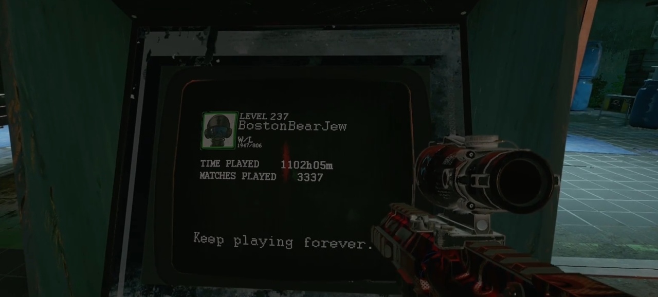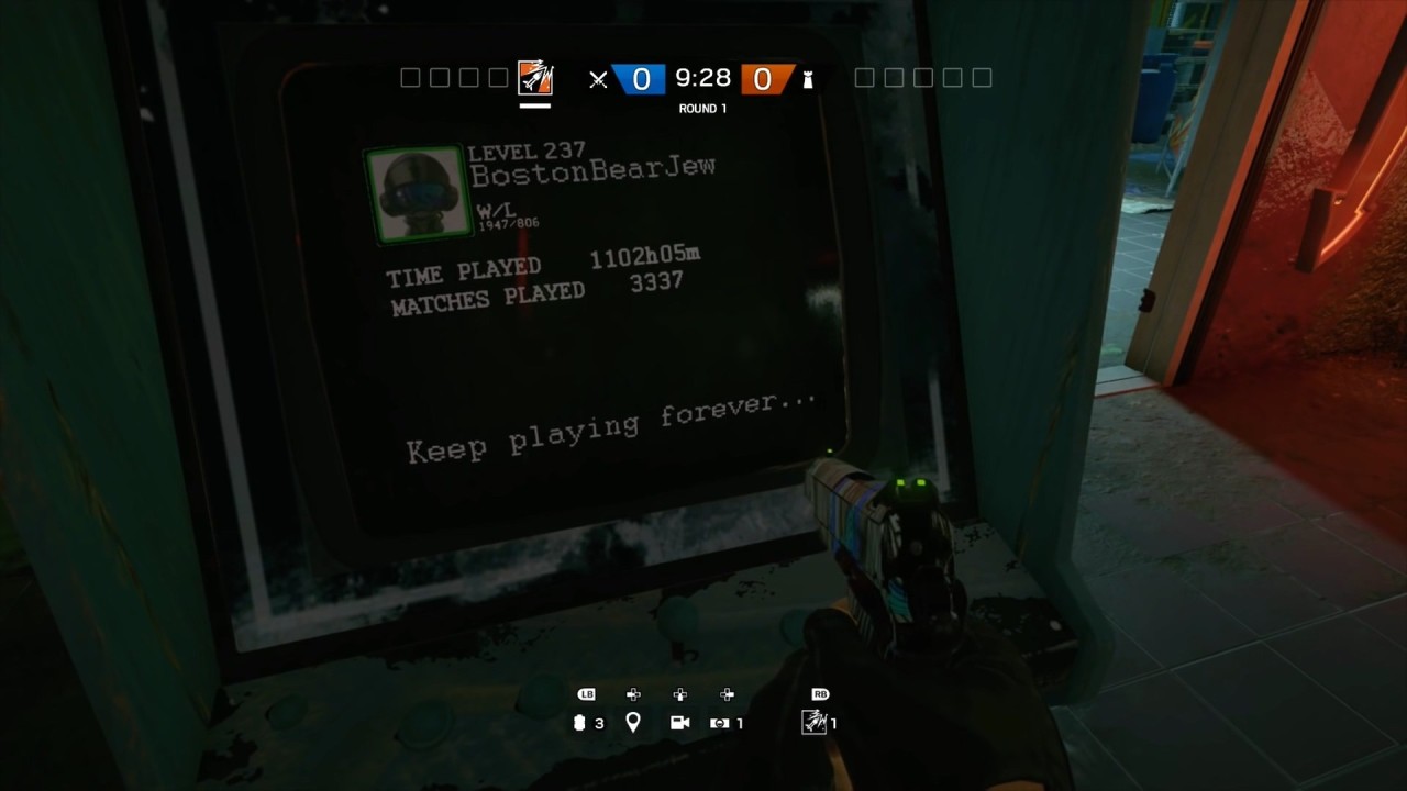 在《彩虹六号:围攻》的地图游乐场的正门楼梯转角处的街机上,显示着一位名为“BostonBearJew”的个人信息:237级、1947胜/806负、游玩时间1102小时05分钟、完成比赛3337场,信息下方还写着“要永远玩下去”。