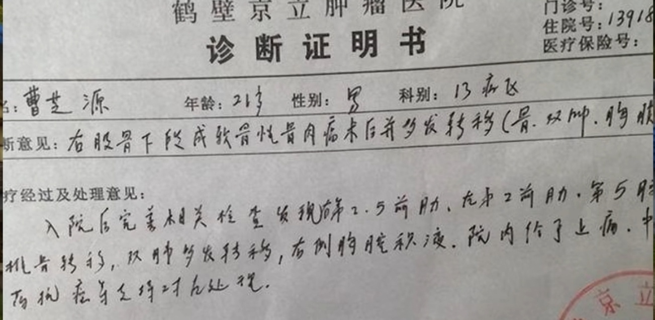 也许是天妒英才,在2011年,曹芝源被查出患有右腿骨肉瘤,医院给出的建议是化疗或者截肢,由于化疗的代价太大,于是曹芝源选择了截肢,截肢后的曹芝源不仅没有自暴自弃,而是比以前更加阳光开朗 也许这就是他的魅力所在吧,他开始更加积极的参加魔兽公会组织的各种活动,去帮助游戏里的陌生人,甚至他还不顾行动不便,在现实里大大方方的和魔兽战友见面。他的生活本该这么继续阳光下去,可是意外来了。