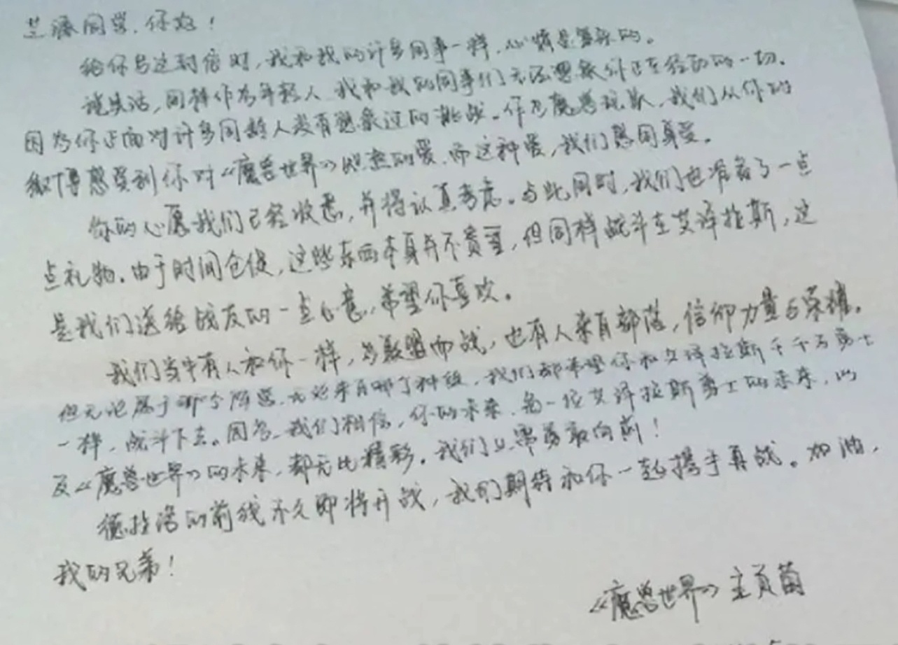 原来,曹芝源给魔兽世界国服运营团队写了一封信,希望他能够成为艾泽拉斯大陆上的一个NPC,这样他的家人和朋友如果想他了,就可以上游戏看一眼,没过多久,曹芝源就收到了官方的回信,官方希望他可以继续乐观的面对病情,为生活以及艾泽拉斯而战,官方也会尽最大的可能帮助曹芝源实现在游戏里变成一个NPC的愿望。
