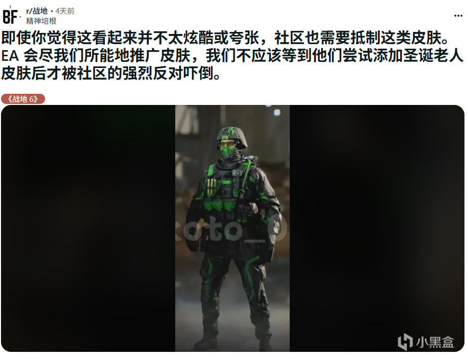 与此同时,类似话题也在其他战地题材作品间蔓延。TheGamer报道,部分《战地》粉丝曾因透漏的一款带荧光绿色装饰的皮肤发起反对,担心一丁点颜色会逐步演变成更夸张的选项。有人由此认为,Treyarch 的调整既可能是被舆论逼迫,也可能真心想与竞争对手在“写实路线”上划清界限。