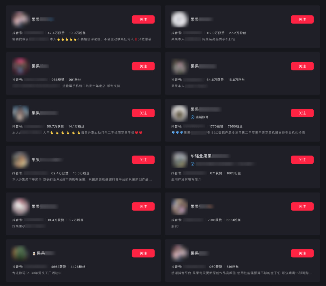 原来“果果姐姐”有非常多的账号,这些账号生产的内容都一样,最终目的都是“小朋友们,加我微信就可以拿到视频中的同款手机哦~”