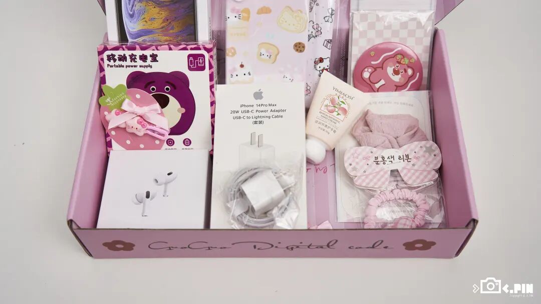 除了手机本体外,里面还有数据线、充电头、充电宝、山寨AirPods Pro、手机壳以及各种小发卡。
