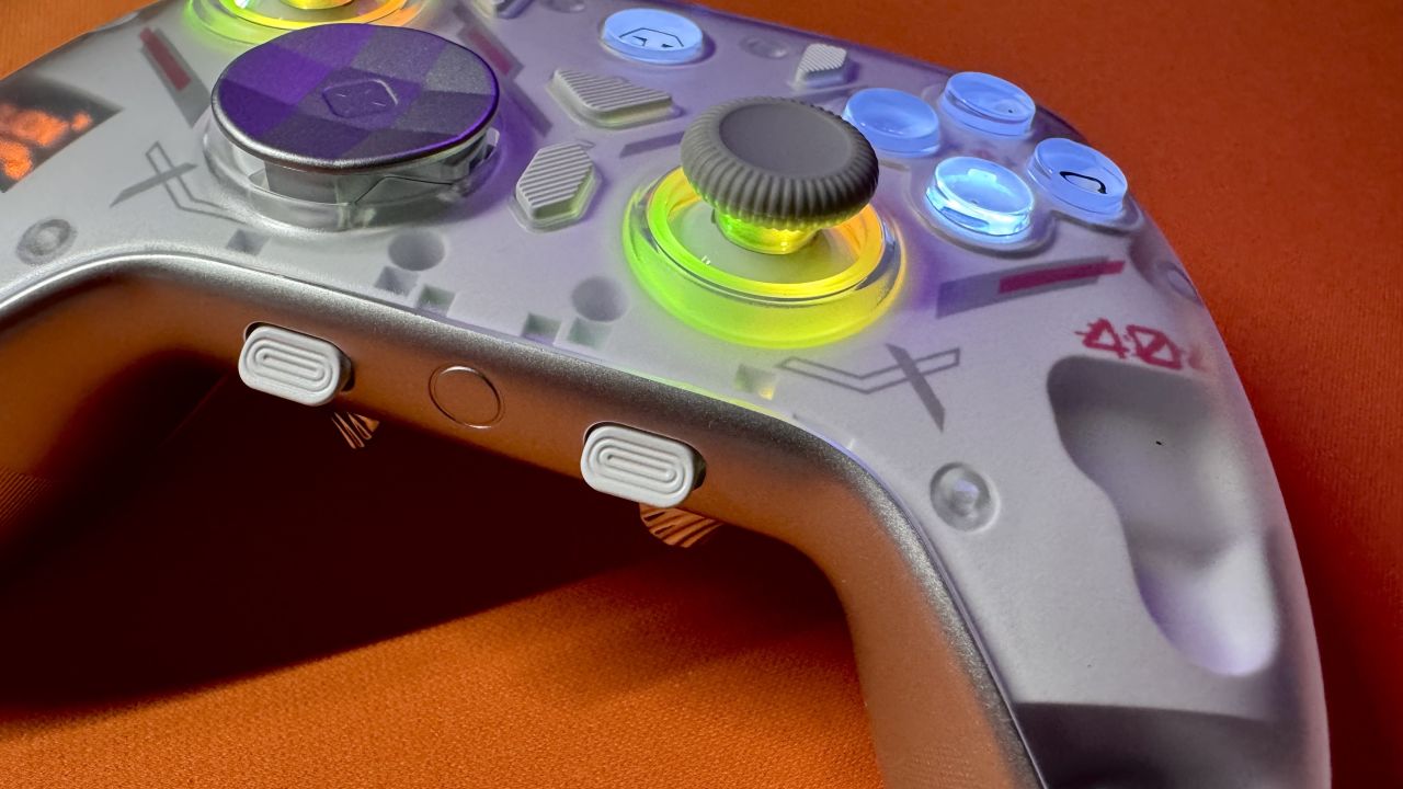 手柄整體的防滑處理也相當到位:面殼部分添加了防汗磨砂材質,握在手中感覺乾爽舒適;背部採用防滑激光紋,即便長時間遊戲手心出汗,也能穩穩地握住手柄。肩鍵與扳機處則有着細膩的按鍵紋理,進一步增強了操作時的摩擦力。