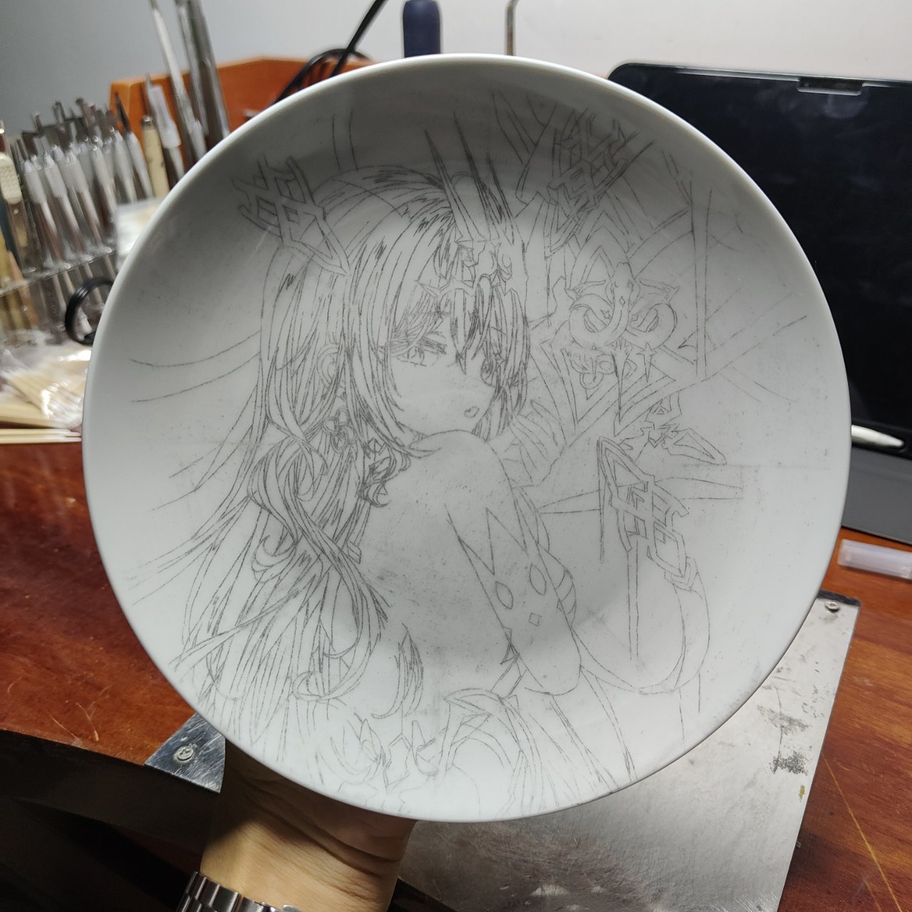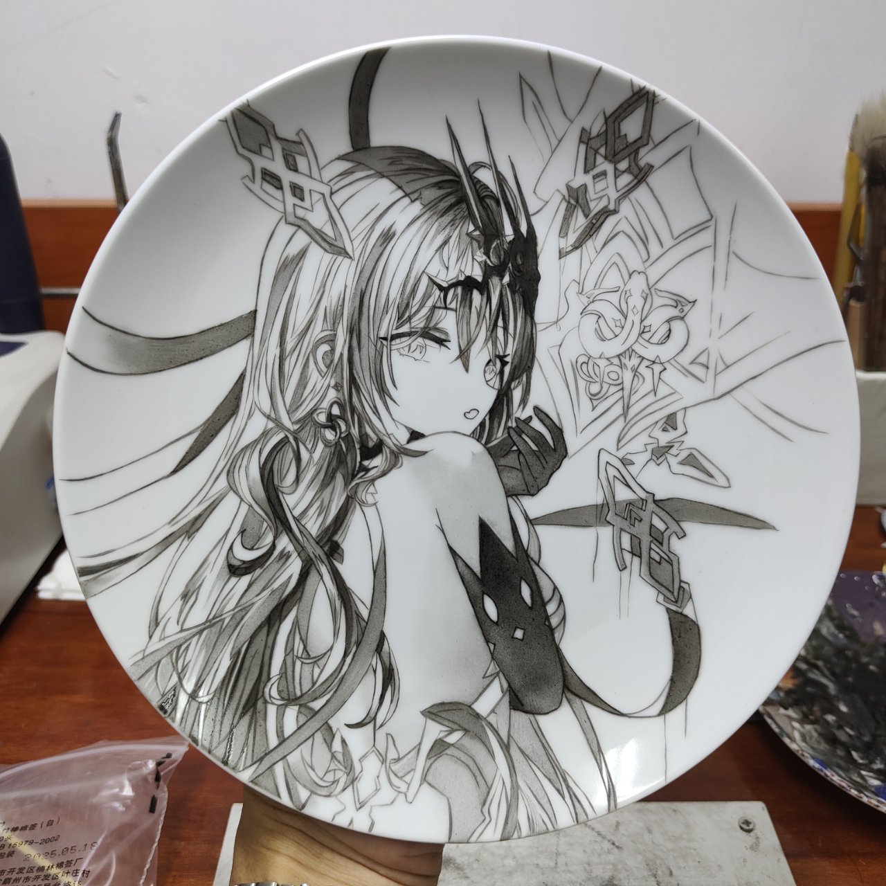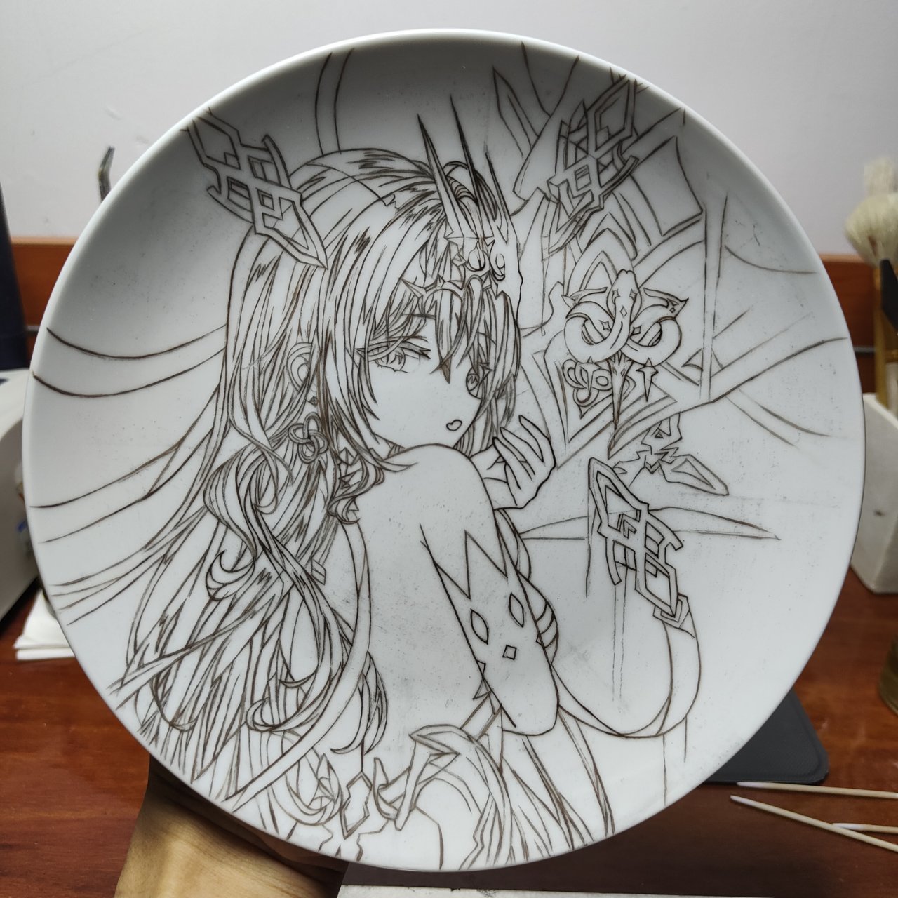 目前畫過難度最高的了底稿用了將近一個小時,線稿勾了兩個半小時,黑白稿三個小時,上色上了四個小時(雖然部分時間有摸魚的成分,但是也是花了挺大功夫)搞完之後明天送去燒製後天出成品,希望一切順利不然lz會瘋的