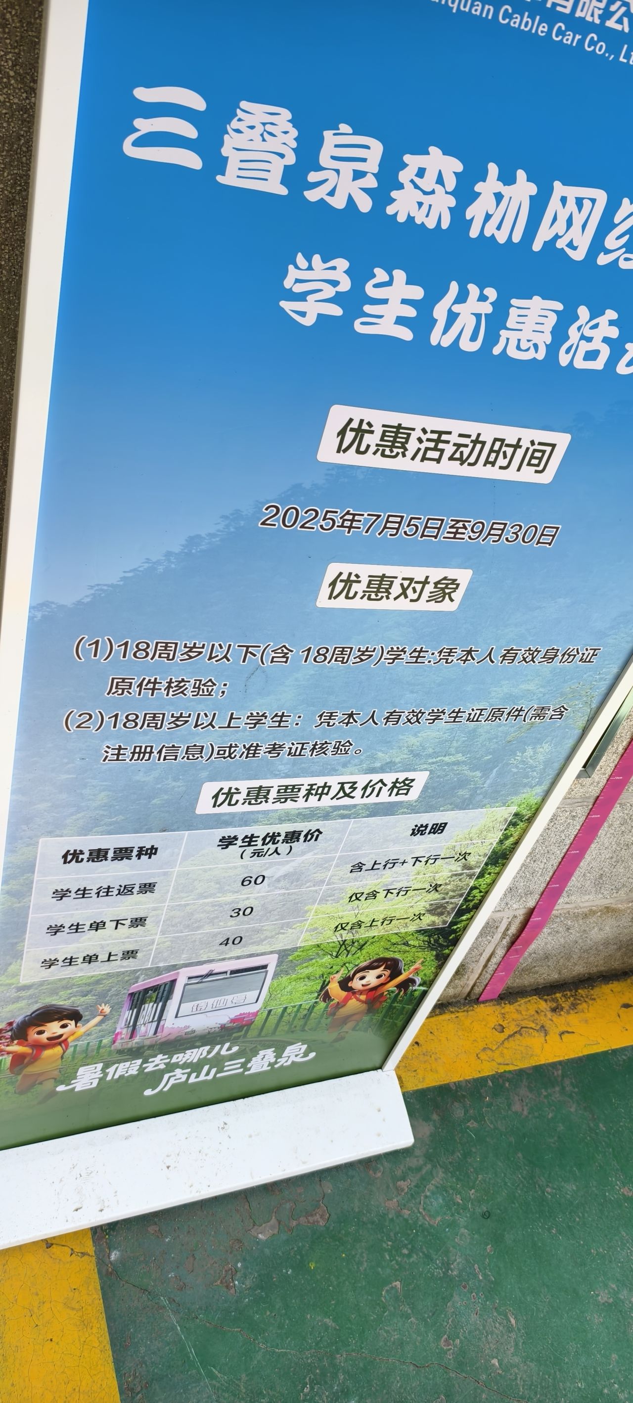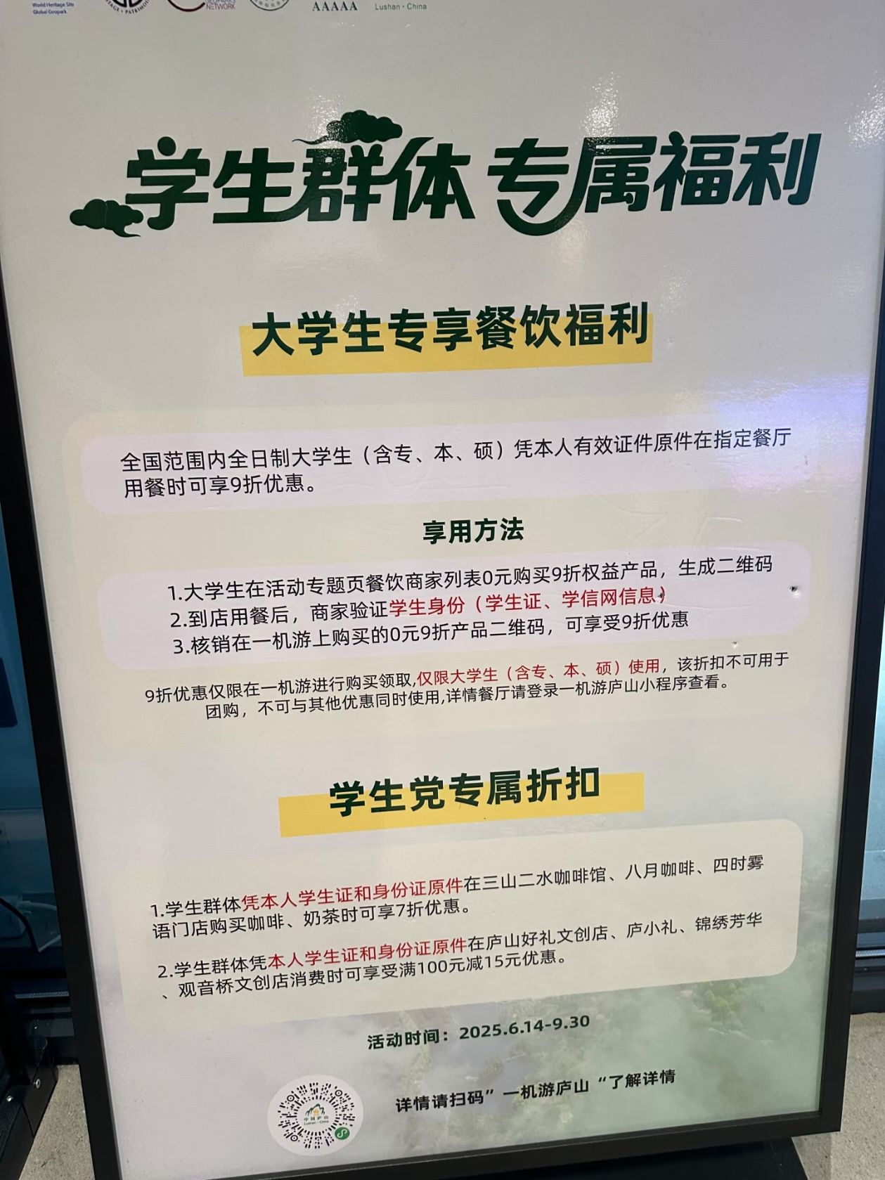 中考生、高考生、大学生可凭借相关证明(如学信网)免门票!并且可以享受优惠索道(80元往返)等福利!在庐山官方小程序预订房间可享八折优惠!(二维码在下图中)