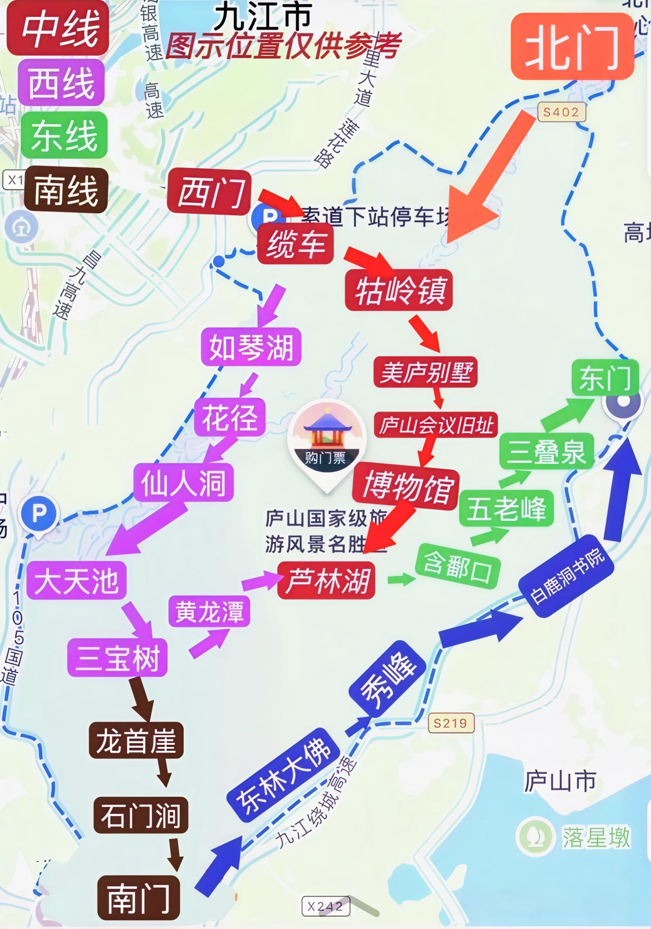 如果您身体素质一般,推荐先游玩人文景点,也就是图中的粉红色(西线)与大红色(中线)线路,每条线路游玩时间约为半天时间。您不必担心景点之间交通不便,观光车系统十分完善,您可以轻松前往任何景区。