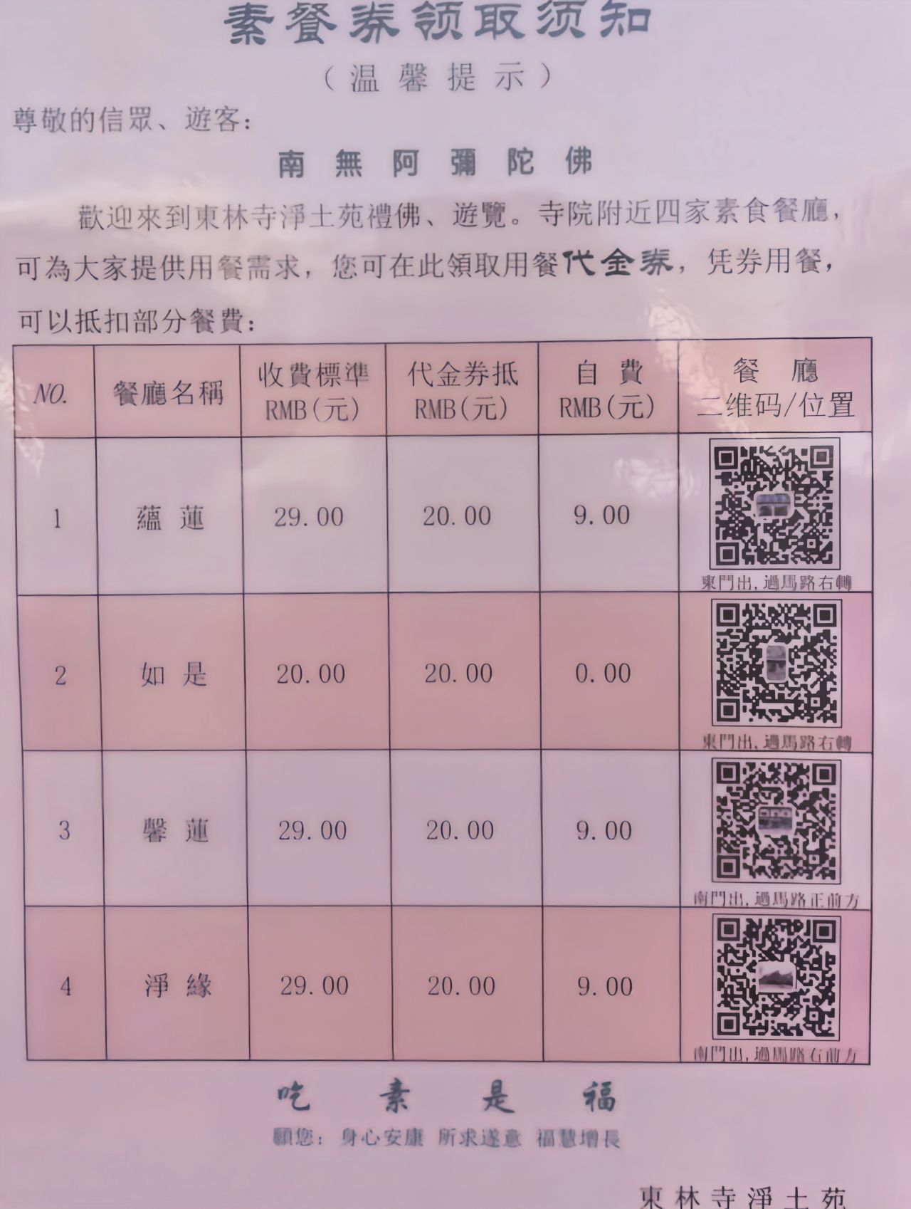 吃饭:山顶佛像下的问询处可免费领取斋饭券,领取时间为9:30 - 11:00 ,每天限量。也领取20元抵扣券,食堂在山下,原价是29/人,卷后仅需9元。