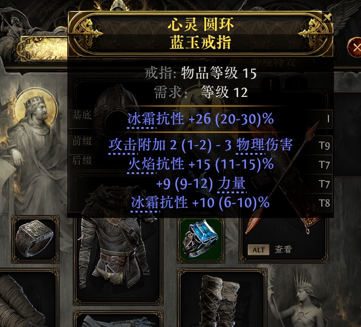 头盔、胸甲和腰带找生命值和冰抗就行,第一章尾王是冰属性攻击,冰抗堆到40%以上打起来会很轻松。