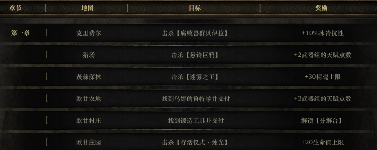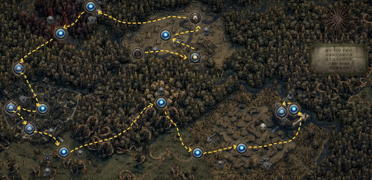 这里小二也准备了流程图,可以参照图的顺序走就行,污流河畔→营地→克里费尔→韧性森林→红谷→阴森网道→永恒园林→猎场→茂棘深林→欧甘农地→欧甘村庄→庄园城壁→欧甘庄园。