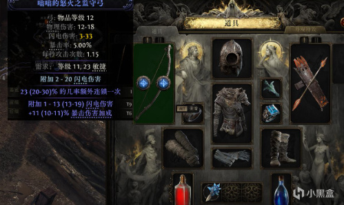 武器小二推荐萌新就弓箭到底,这也是目前锐眼的毕业方向,还可以提前熟悉技能连招。装备筛选上面弓箭、手套和箭袋优先保证物理和闪电伤害,小二这个号比较黑弓箭是一个橙装都没出,只能逛商店。