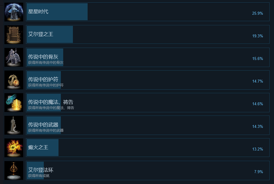 目前根据 Steam 成就列表上显示全体玩家获得成就占的百分比,获得隐藏结局成就“星星时代”的玩家占比要多于获得“普通结局”成就“艾尔登之王”的玩家。