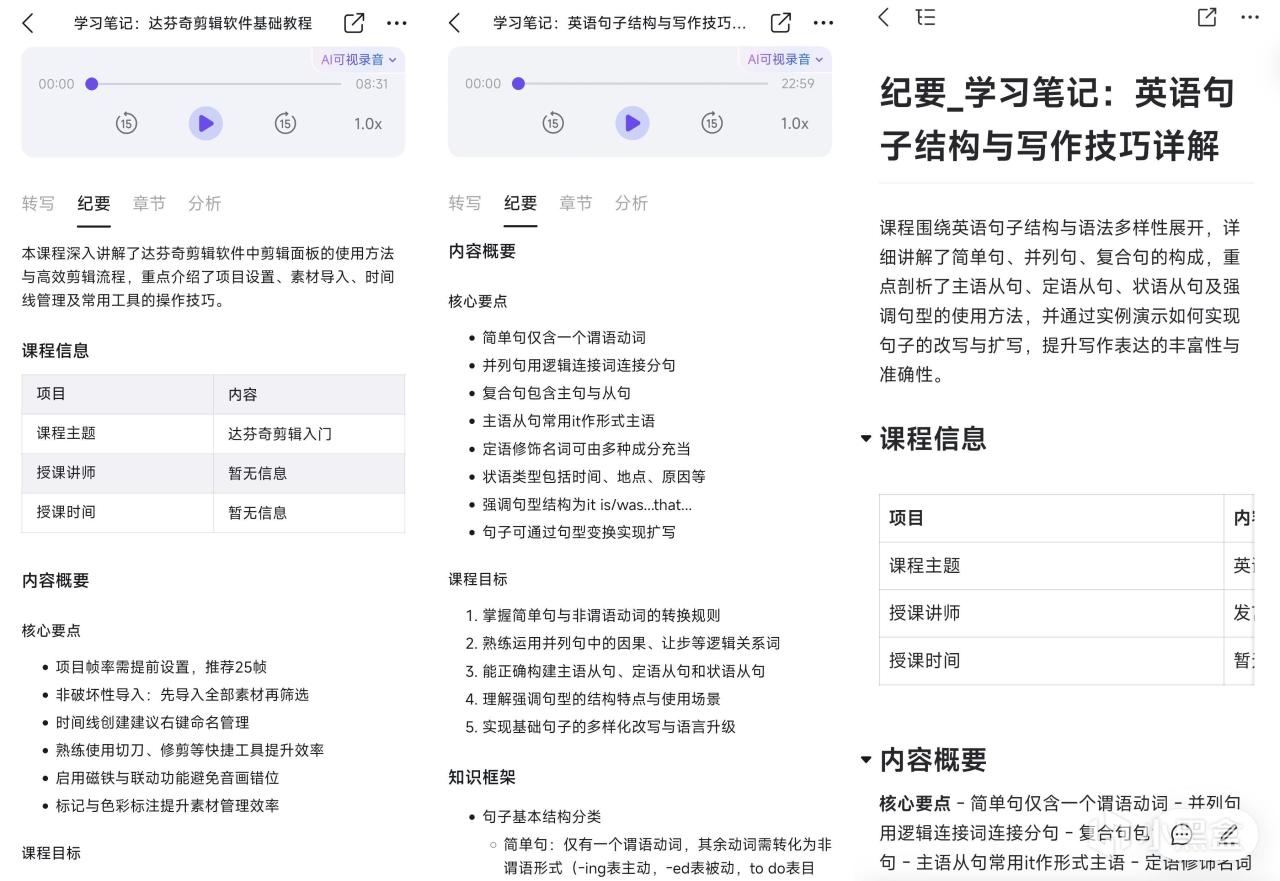 無論是影視剪輯課程還是英語四六級課程,其紀要中都能幫你概括出課程中的要點,就像是學霸直接幫你整理好了重難點筆記,學習複習都能更加直觀,還能直接導出成釘釘文檔。