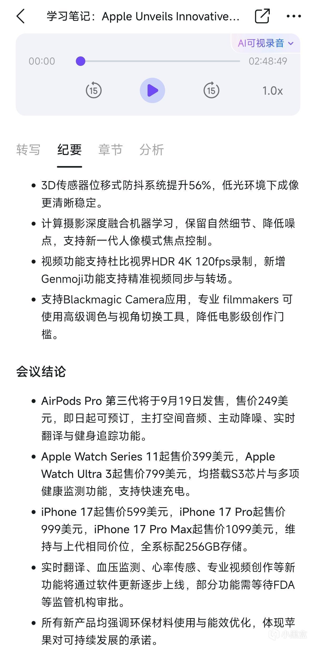 作爲數碼博主,再來試個產品發佈會場景——蘋果iPhone 17發佈會實時英文翻譯中文+會後中文紀要,發佈會後直接就能出總結,讓我第一個出稿。