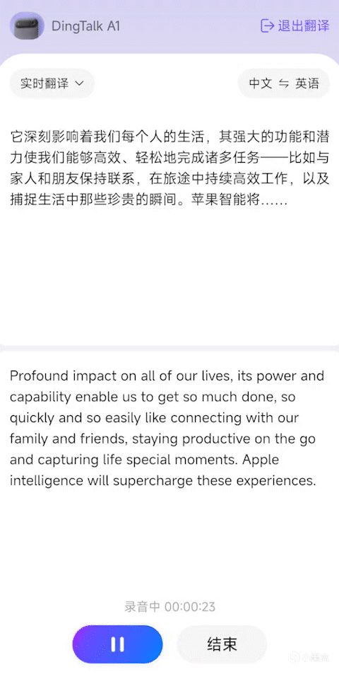 在錄音的同時也支持實時AI翻譯,速度也很快。支持實時翻譯模式,支持8種語⾔相互語音翻譯和21種語言的同聲傳譯模式。
