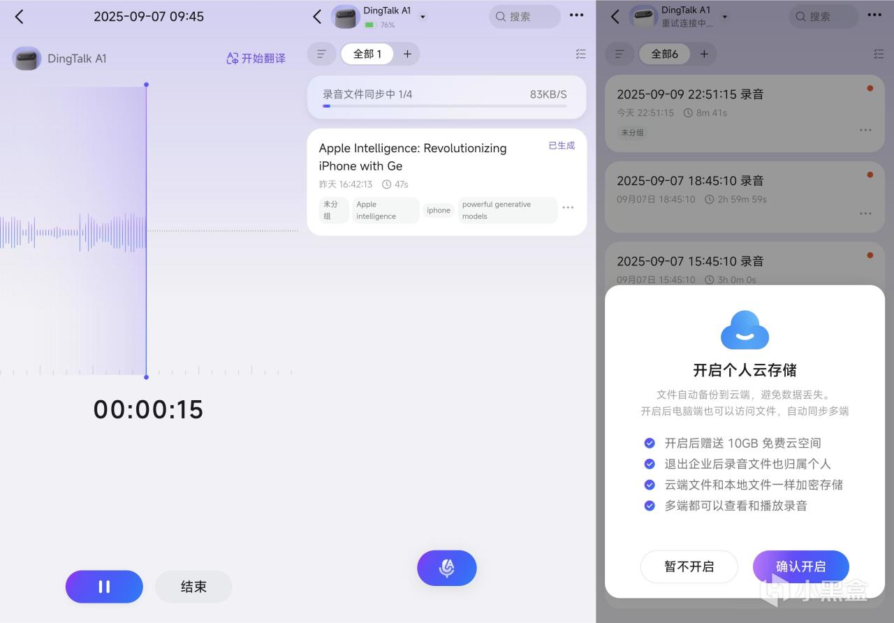 DingTalk A1會贈送10GB的個人永久雲存儲權益,錄音不僅能同步到手機釘釘,還能自動上雲,方便你在各個設備回放使用,避免數據丟失。