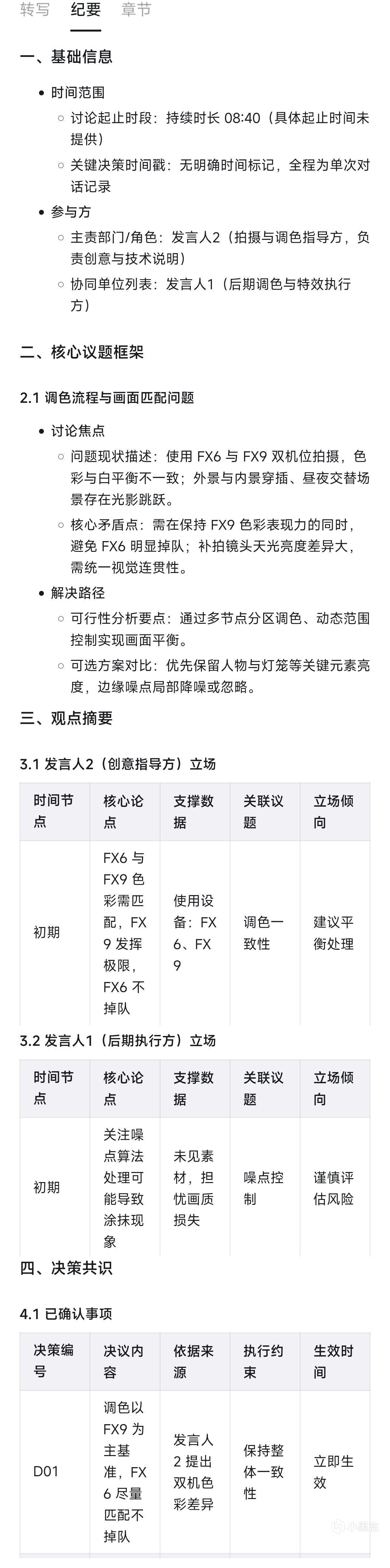 首先是職場中最常用的會議討論、工作通話場景,這裏我用拍戲期間一場討論來給大家看看效果,原文太長我只截取其中部分給大家展示結構。