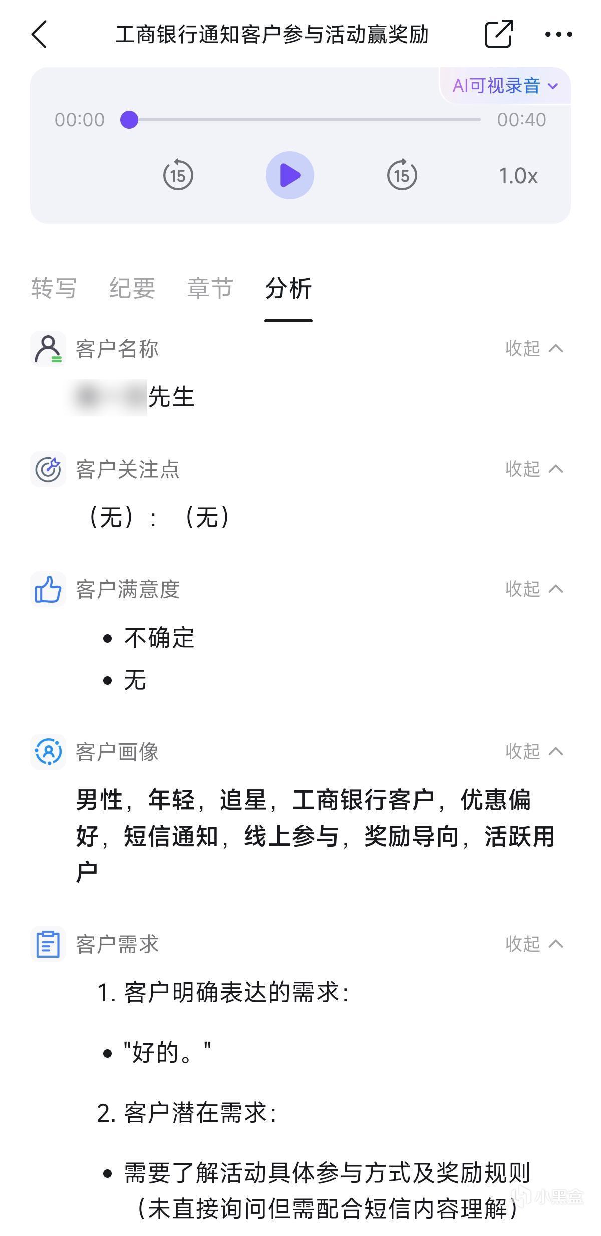 對於客服銷售場景,AI助理也能迅速提取出客戶姓名、關注點、畫像、滿意度、需求等重點內容。