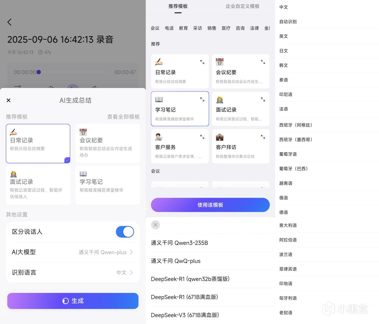 AI大模型目前有阿里自研的通義千問QwQ-plus(學術研究輔助)、Qwen3-235B(通用摘要),也支持Deepseek-R1的qwen32b蒸餾版(速度較快的短文本摘要)、671B滿血版(強邏輯推理)和Deepseek-V3 671B滿血版(複雜語境連貫摘要),可以根據不同場景需求切換。