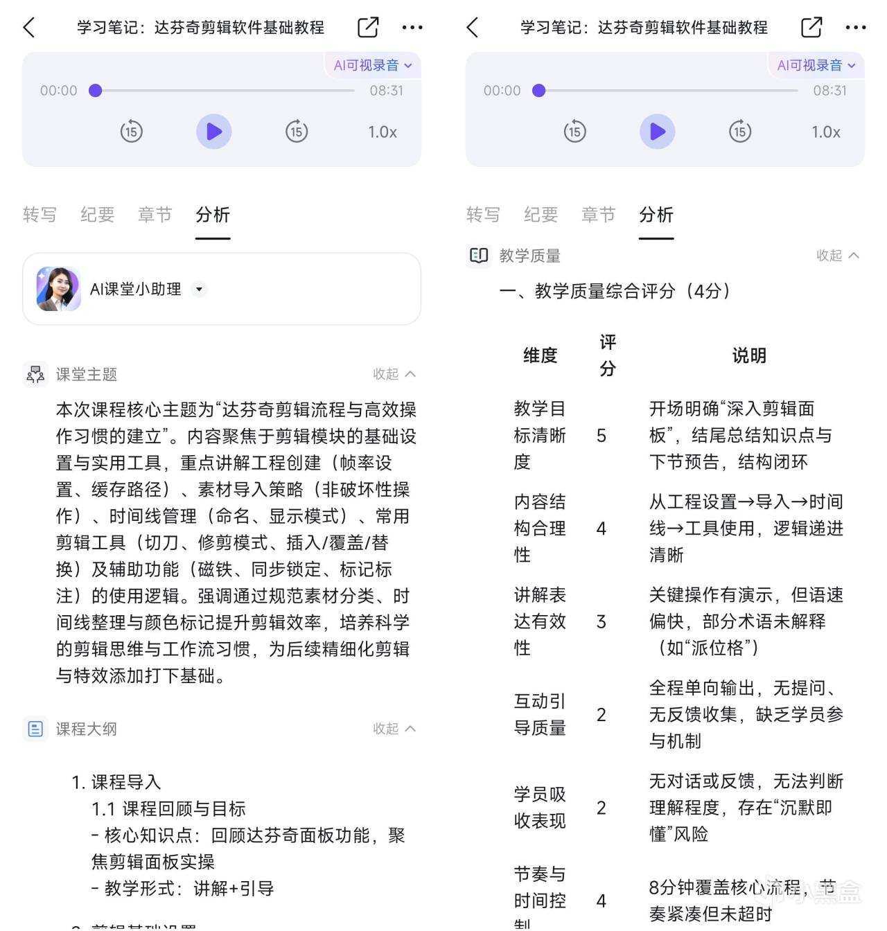 DingTalk A1超出我預期的是,其不僅面向我們常見的學生角色下了功夫,利用AI分析功能的強大能力,還實現了智能分析課程質量,像是以往需要專業教師輔助進行復盤的教研場景,現在AI就能直接反向輸出教案,進行評分,指出優缺點和改善方向。