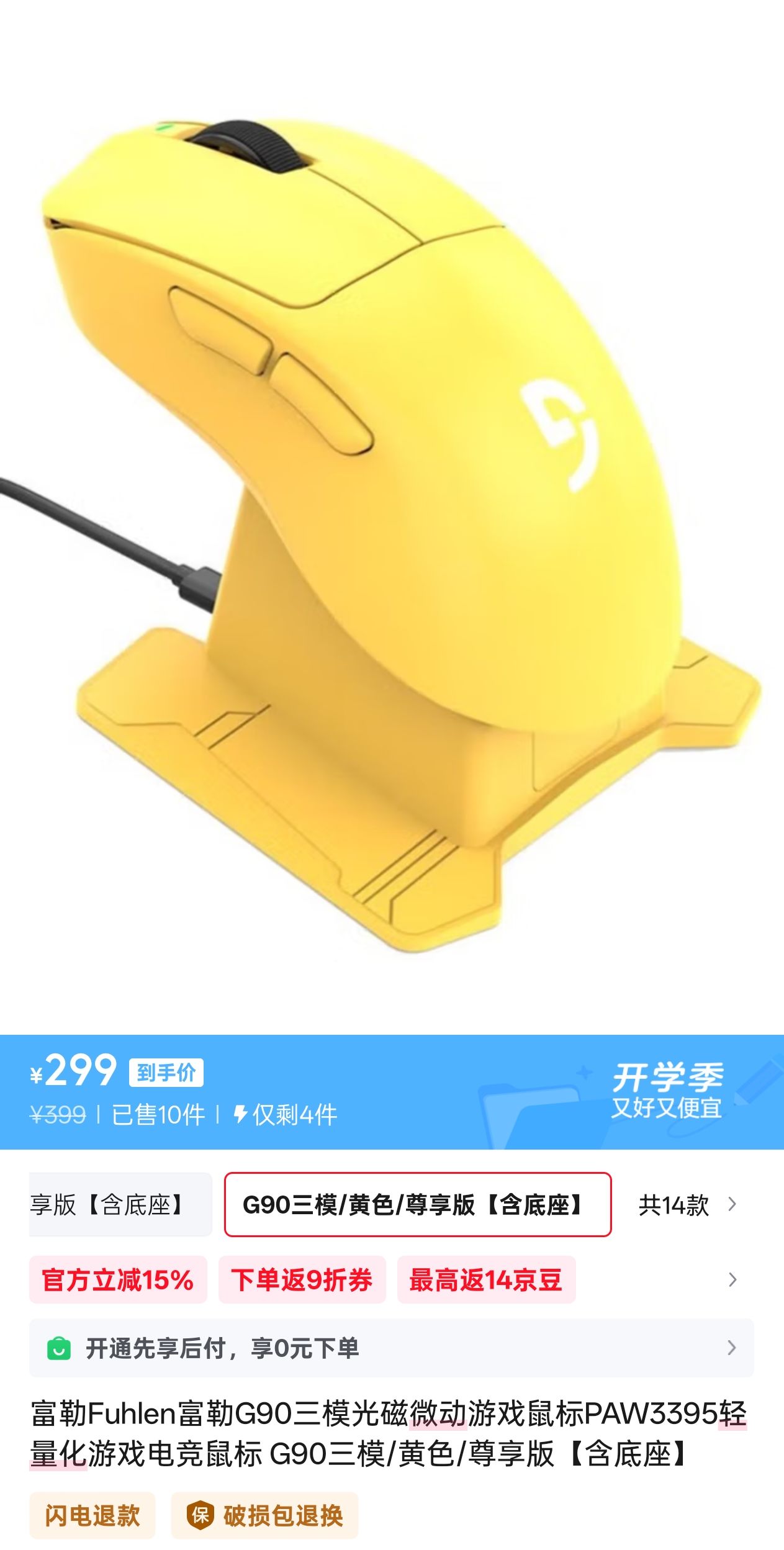 G90三模一共有两个版本,一个是不含磁吸充电底座的“经典款”,定价199;另一个则是含磁吸充电底座的“''尊享版”,定价299。如果你有入手的打算,建议从淘宝旗舰店购买,可以用淘金币抵扣,价格就由199元变成了182元。