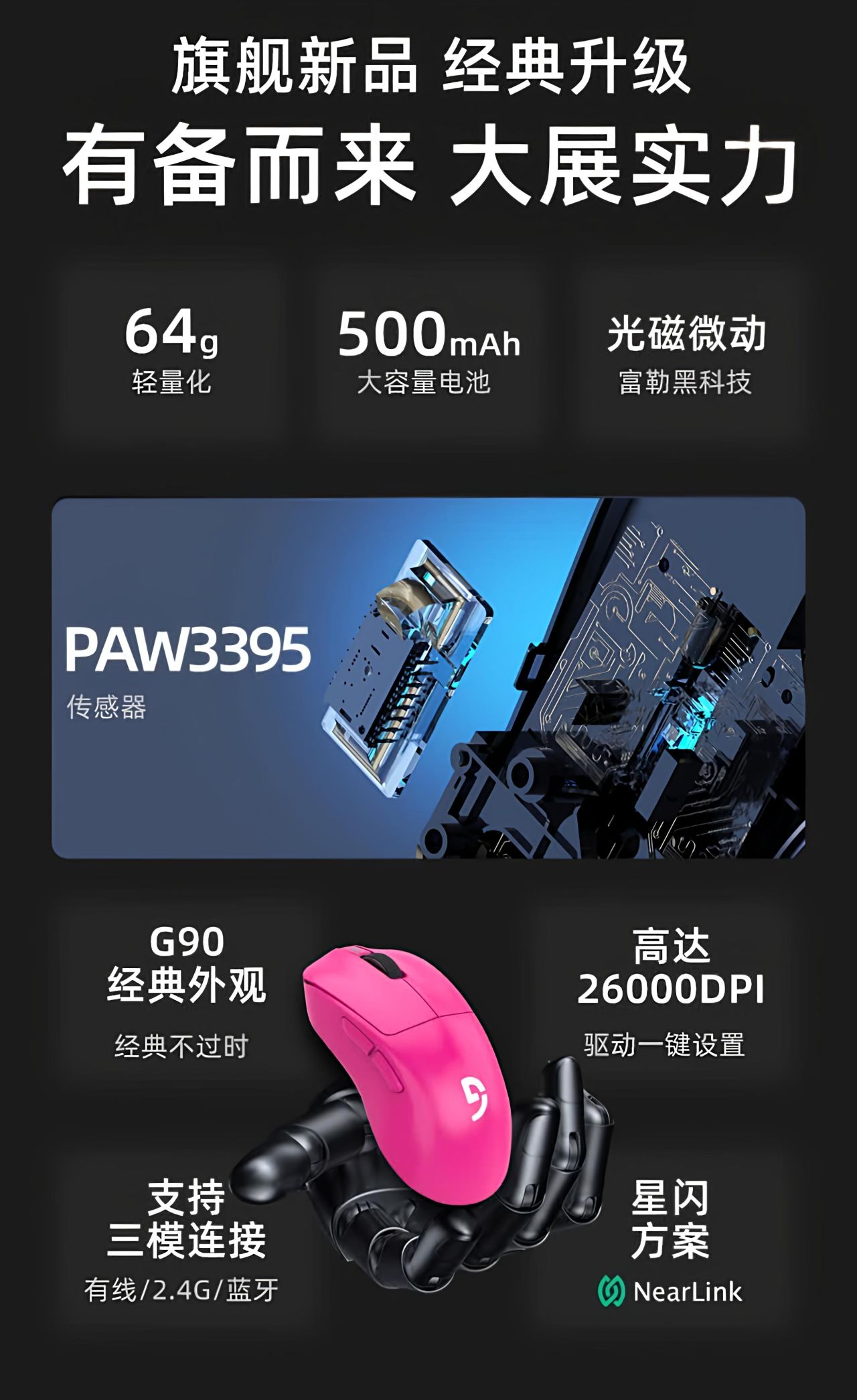 知道富勒的,应该都是外设圈的老人了。距离上一次富勒发布G90光磁微动有线鼠标已过去9年,回首望,EVO都有七年了……七年时间,国产鼠标的老前辈们,双飞燕、富勒接连被市场边缘化,取而代之的,是新秀频出,雷柏、仁魔、ATK……九年后,一代经典产品,光磁微动G90终于在近日迎来了自己的升级换代——富勒G90三模!