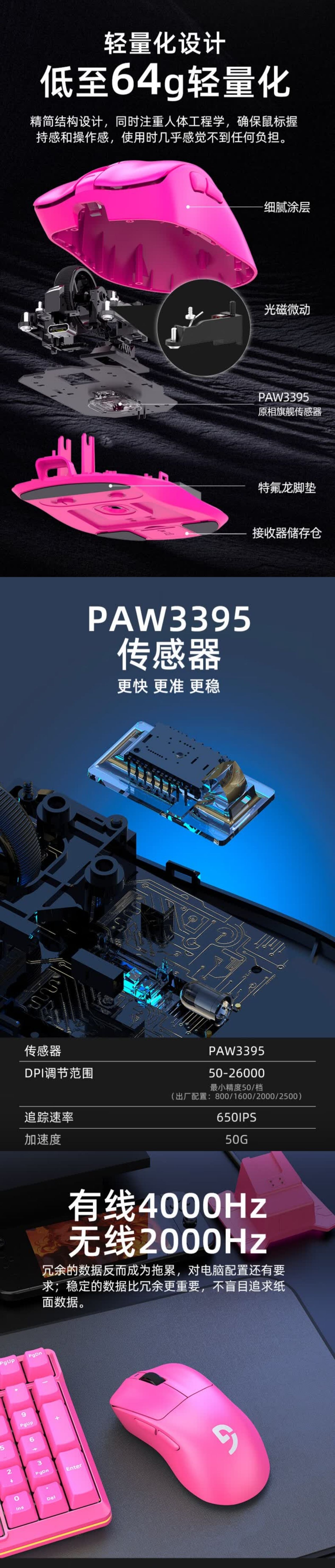 富勒G90三模除继续使用自家标志性专利技术光磁微动(区别于光微动)外,这次也选择了星闪方案,回报率为有线4K,无线2K,搭配的是原相3395的传感器,那基本可以断定主控芯片应为海思BS-25。需注意,G90三模并未使用上防滑涂层,表面是类肤磨砂。