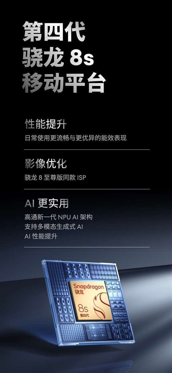 與前代相比,驍龍8s Gen4的CPU性能提升高達31%,整體能效相比前代也顯著提升,足夠用戶多打2小時電話,多聽1小時音樂,或者多打1小時遊戲。