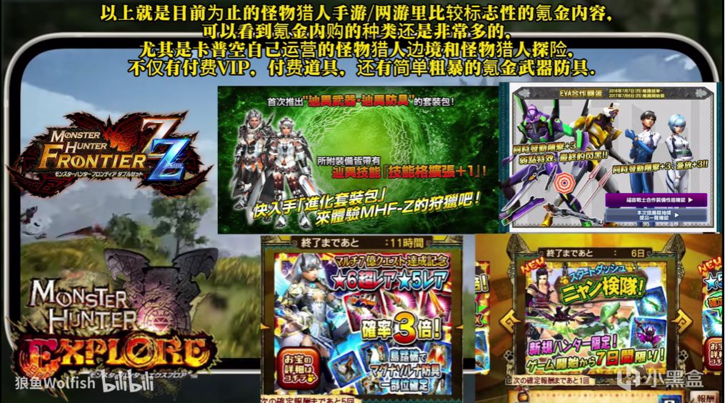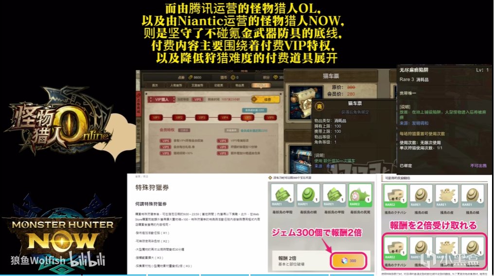 以上就是目前为止的怪物猎人手游/网游里比较标志性的氪金内容,可以看到氪金内购的种类还是非常多的,尤其是卡普空自己运营的怪物猎人边境和怪物猎人探险,不仅有付费VIP,还有直球的氪金武器防具。而由腾讯运营的怪物猎人OL,以及由Niantic运营的怪物猎人NOW,则是坚守了不碰氪金武器防具的底线,付费内容主要是降低狩猎难度的氪金道具和特权增幅。