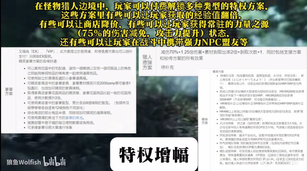 在怪物猎人边境中,玩家可以付费解锁多种类型的特权方案,这些方案里有些可以让玩家获取的经验值翻倍,有些可以让商店降价,有些可以让玩家获得常驻的力量之源(75%的伤害减免,攻击力提升)状态,还有些可以让玩家在战斗中获得随机的支援道具等