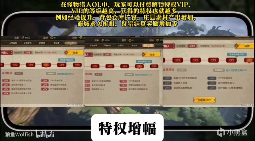 在怪物猎人OL中,玩家可以付费解锁特权VIP,VIP的等级越高,获得的特权也就越多,例如经验提升,背包仓库扩容,庄园素材产出增加,商城永久折扣,狩猎结算奖励增加等