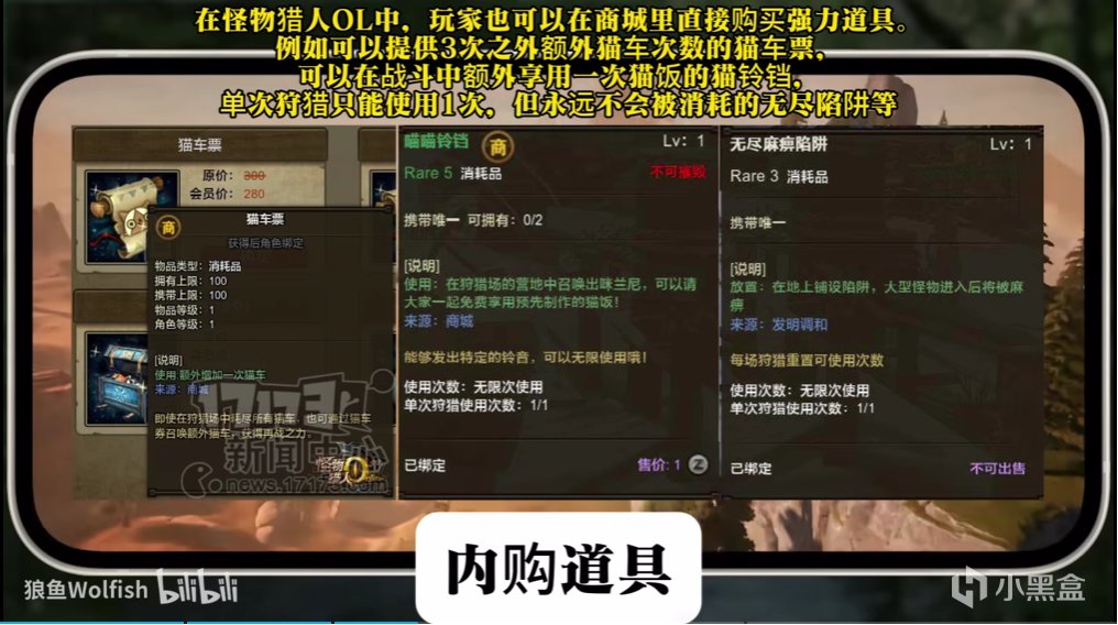 在怪物猎人OL中,玩家也可以在商城里直接购买强力道具。例如可以提供3次之外额外猫车次数的猫车票,抵挡一次致命伤害并且回复一半生命值的古龙精华,2分钟内免疫异常状态的免疫药剂,可以在战斗中额外享用一次猫饭的猫铃铛,单次狩猎只能使用1次,但永远不会被消耗的无尽陷阱等