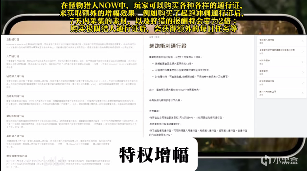 在怪物猎人NOW中,玩家可以购买各种各样的通行证,来获取额外的增幅效果。例如购买了起跑冲刺通行证后,7天内采集的素材,以及狩猎的报酬将会变为2倍;购买极限猎人通行证后,会获得额外的每日任务等
