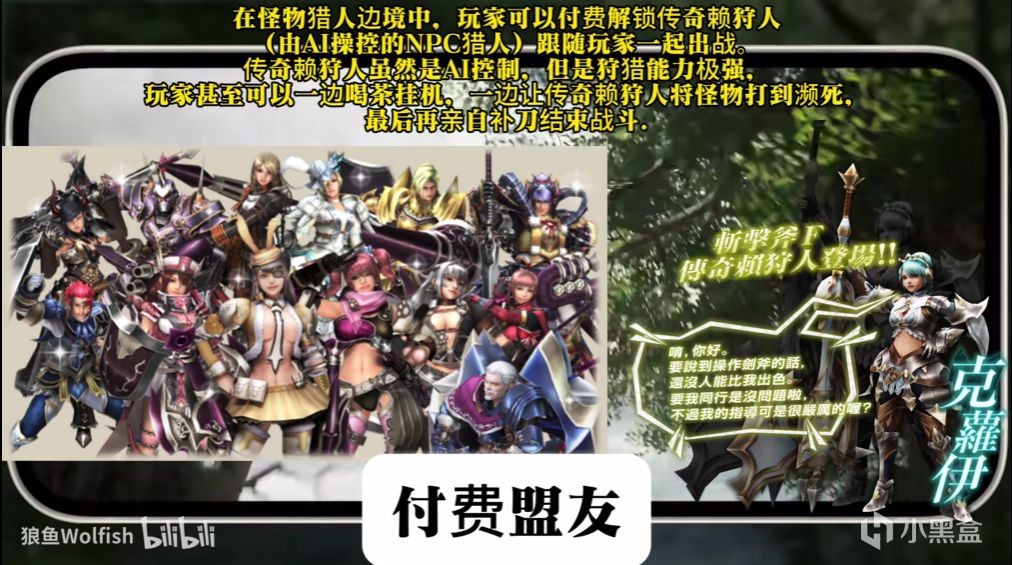 在怪物猎人边境中,玩家可以付费解锁由AI操控的传奇赖狩人跟随玩家一起出战。传奇赖狩人一共有14位,每个角色对应了1种拿手的武器,狩猎能力极强,玩家甚至可以一边喝茶挂机,一边让传奇赖狩人将怪物打到濒死,最后补刀结束战斗,而有时候技术水平一般的玩家,输出可能还不如传奇赖狩人。