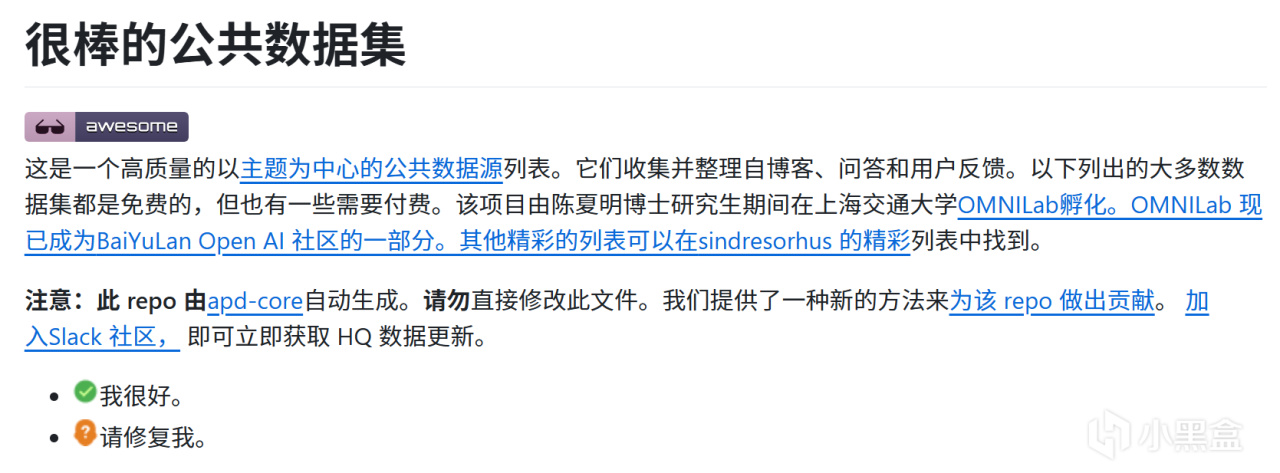 Awesome Public Datasets 是一個主題導向的高質量公開數據集清單,最初由上海交通大學OMNILab在陳明夏博士攻讀博士期間孵化,現隸屬於白玉蘭開放人工智能社區。這些數據集從博客、問答及用戶反饋中收集整理而來,大部分可免費使用,部分需額外授權的數據集也會明確標註,同時項目會通過apd-core自動生成,不支持直接修改文件,有貢獻需求可通過指定方式參與。