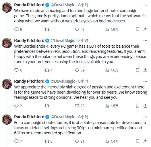 在X平台上,Pitchford坚称问题根源在于PC玩家的预期而非游戏本身。"每位PC玩家都必须认清硬件配置与软件表现之间的客观关系,"他写道,并强调《无主之地4》已经"做到了相当程度的优化",玩家完全可以通过调整分辨率、帧率和画质选项来取得平衡。
