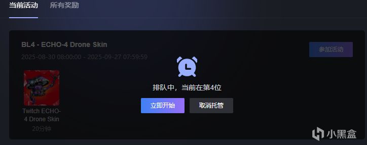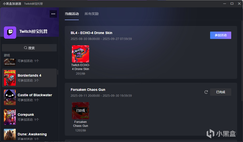 绑定完成后回到小黑盒加速器的掉宝工具,找到《无主之地 4》掉宝栏目,再点击参加,就可以一键托管啦!而且还可以同时排队别的游戏掉宝活动哦,非常方便!
