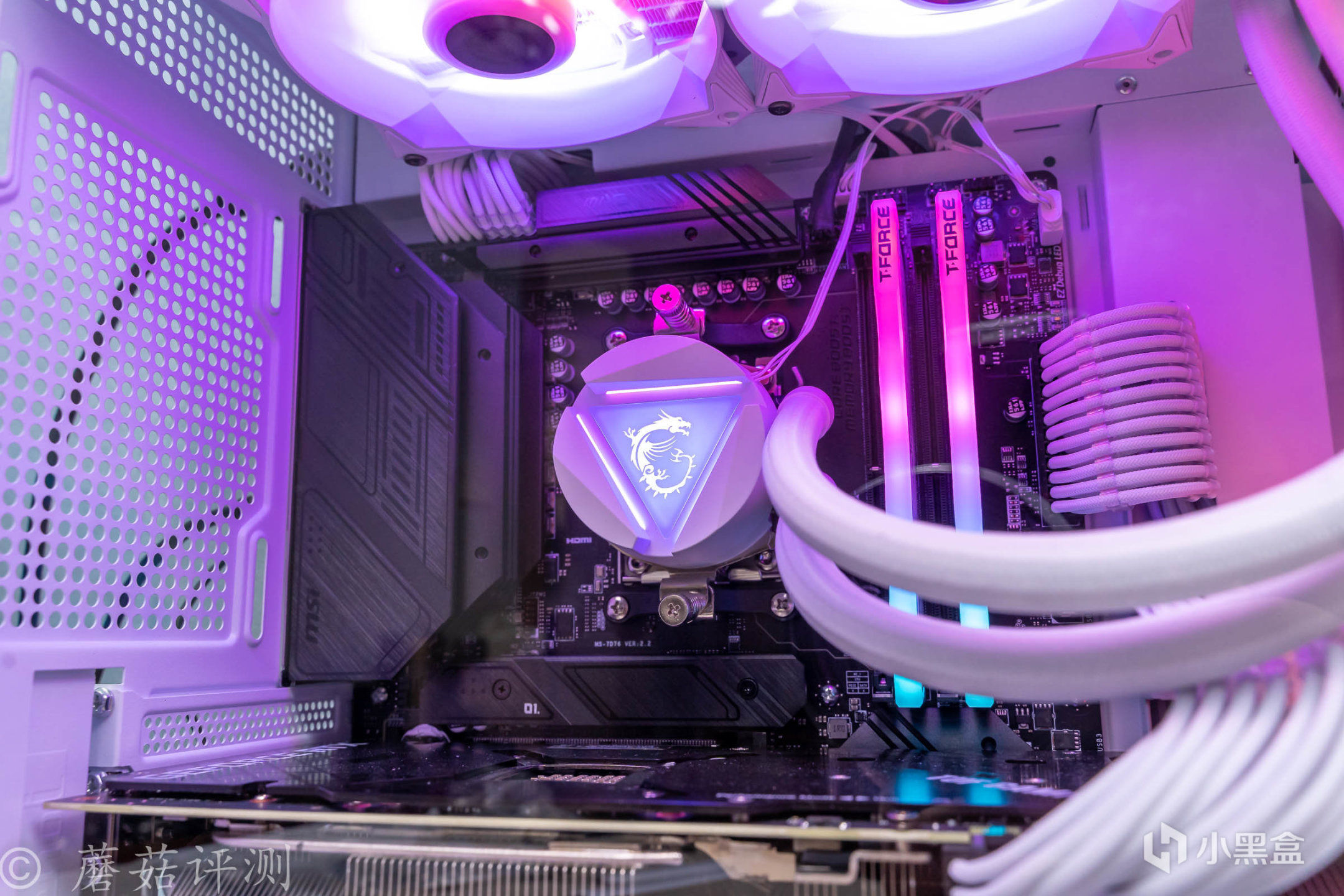 ▼處理器是7900X,用來壓制的散熱器是微星的寒冰240R白色一體式水冷,整體的顏值非常漂亮。水冷的水冷頭頂部採用特殊的三角形設計,中間有微星經典的魔龍LOGO,支持ARGB燈效。