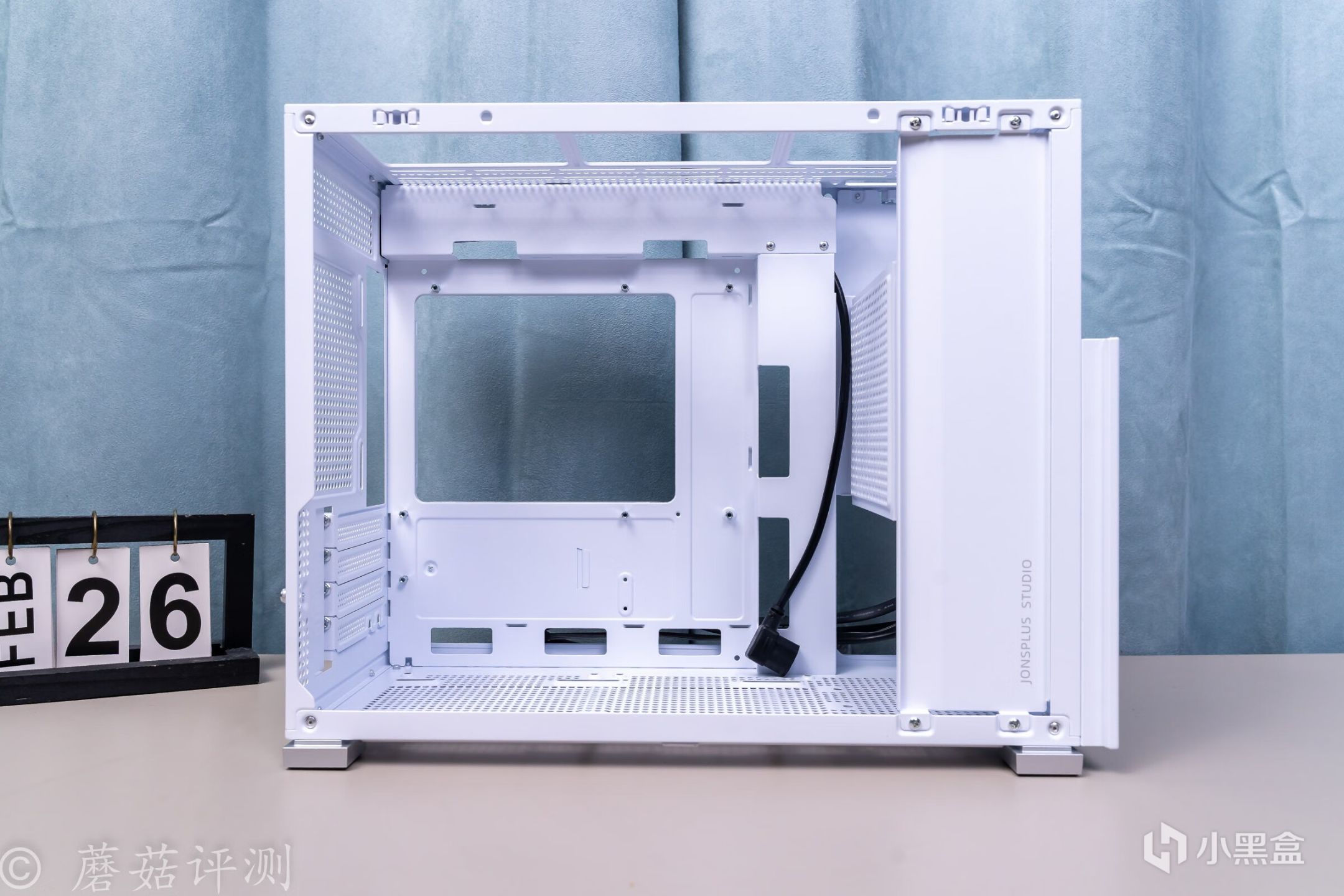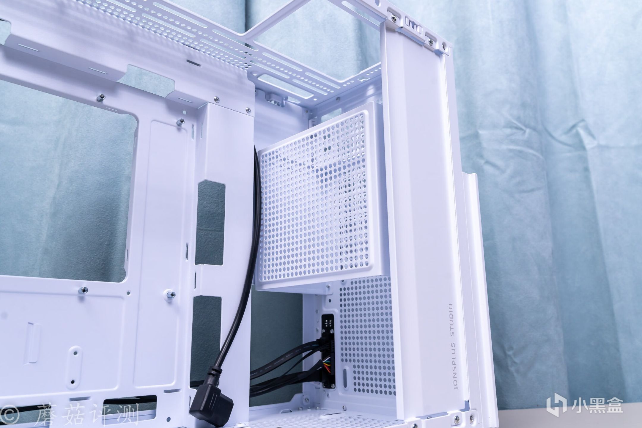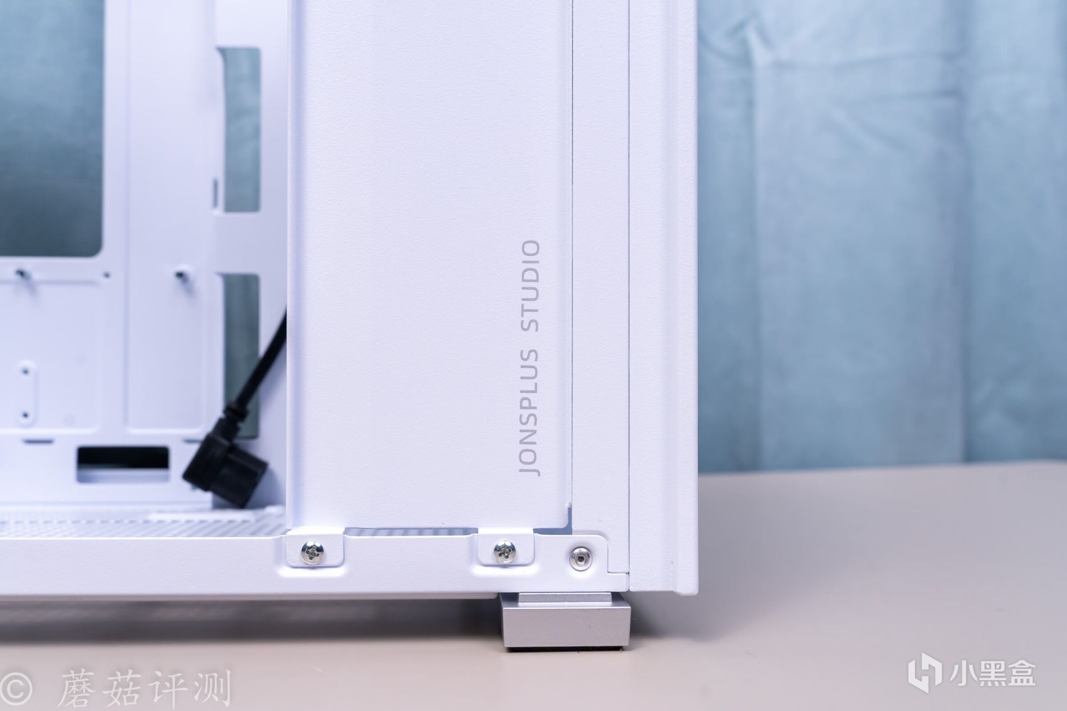 ▼機箱的右側是金屬擋板,用於遮擋電源倉。金屬擋板的底部,還有灰色的“JONSPLUS STUDIO”字樣,看起來很上檔次。