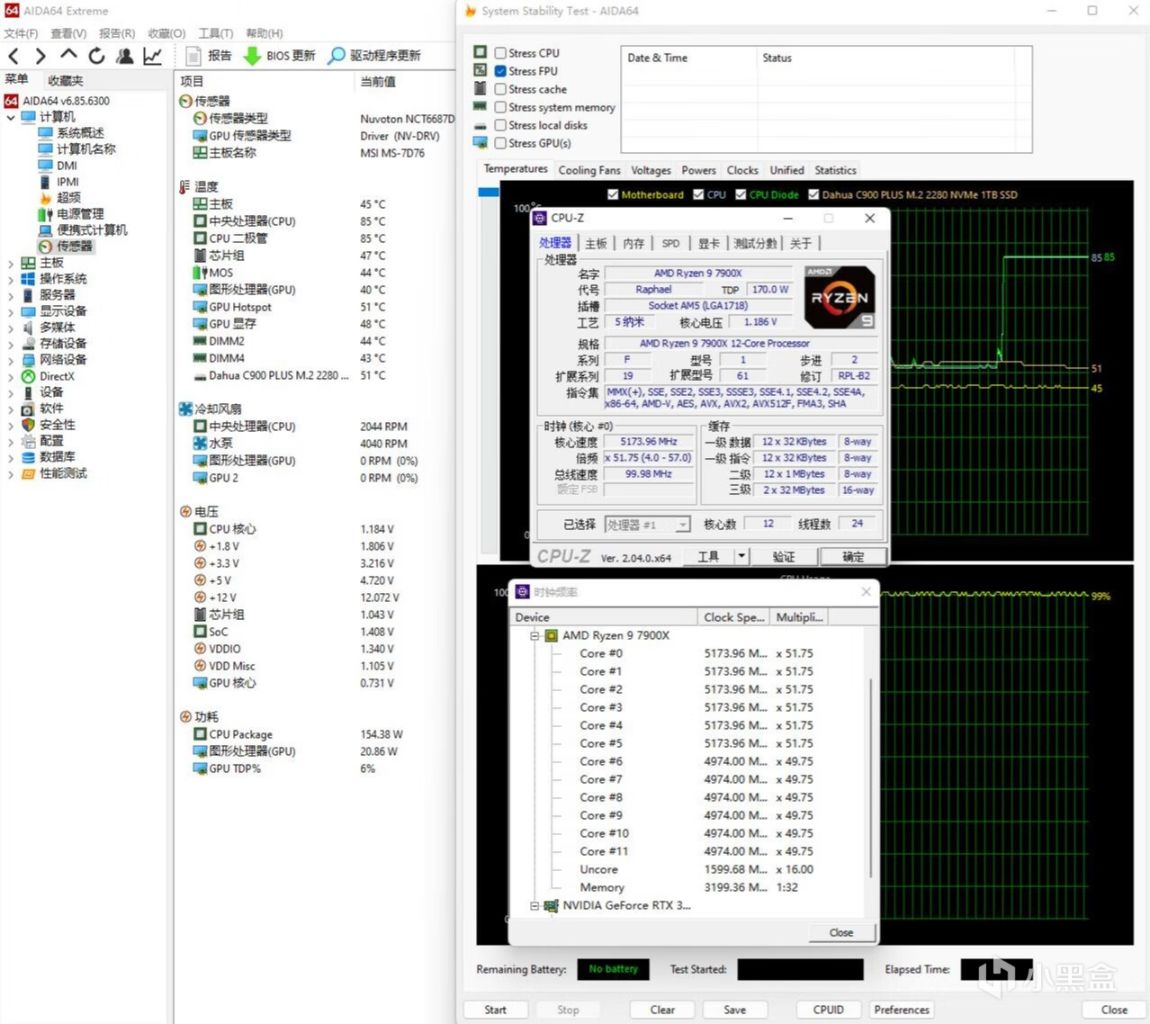 ▼簡單跑個CPU-Z的壓力測試,處理器功耗160W左右,頻率在5.2GHz左右,溫度85℃,固態硬盤溫度51℃。