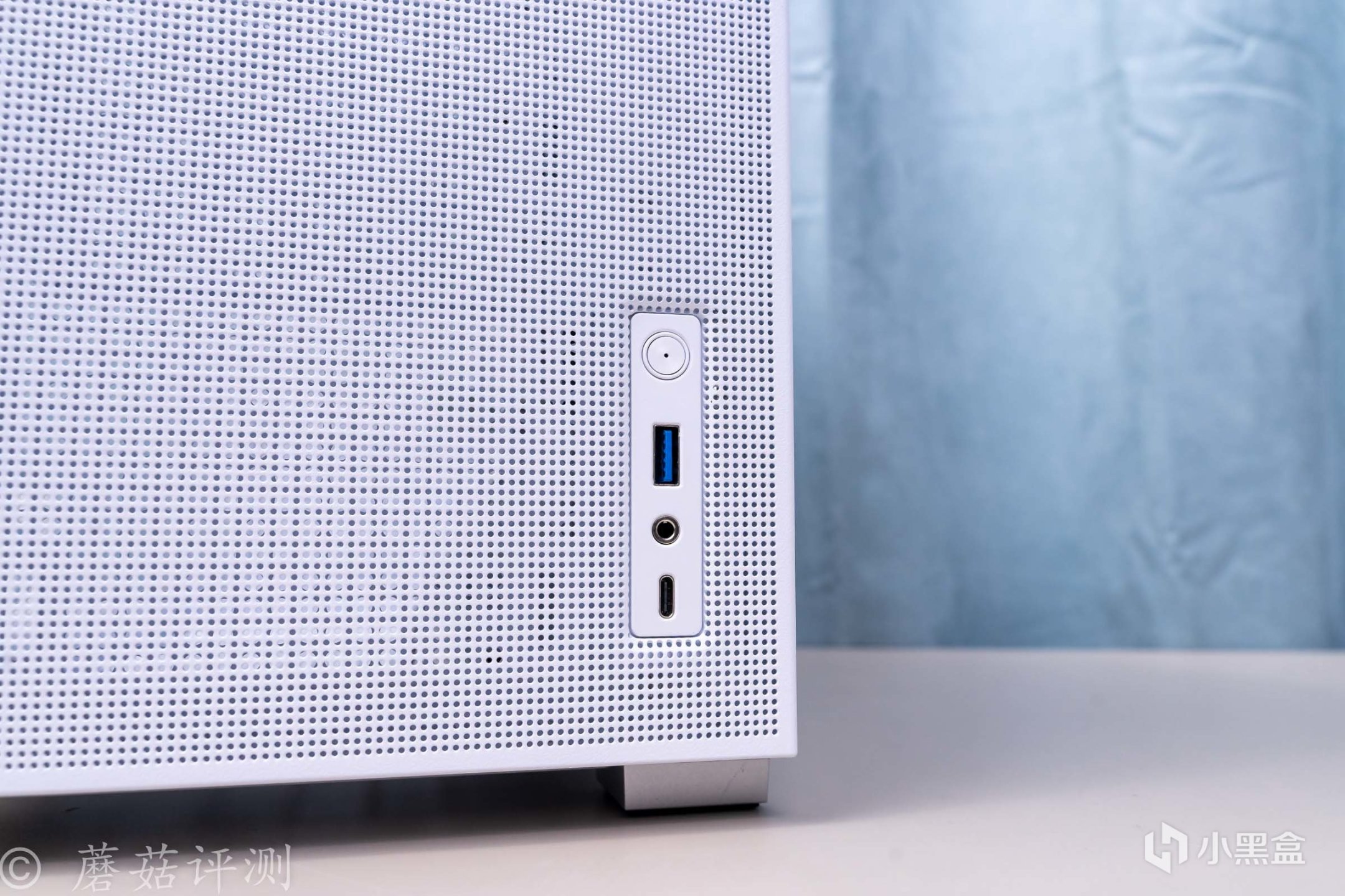 ▼機箱的IO面板在機箱前部的右下角,一個開機鍵,一個USB3.0接口、音頻接口、Type-C接口,開機鍵的中間位置有一個提示燈。