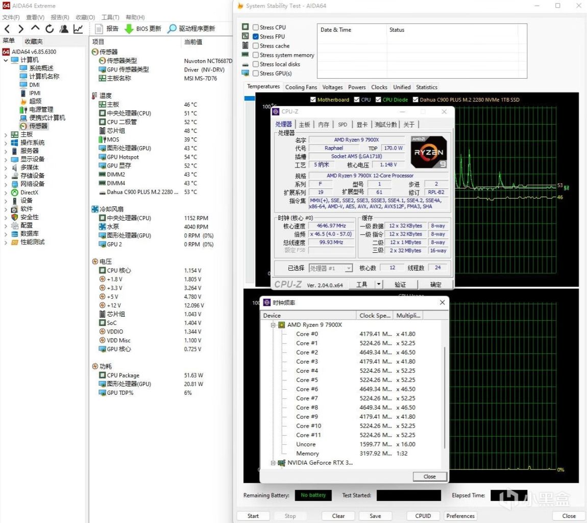 ▼日常待機情況,室溫24℃左右,處理器溫度在51℃左右,固態硬盤溫度53℃,供電溫度39℃。