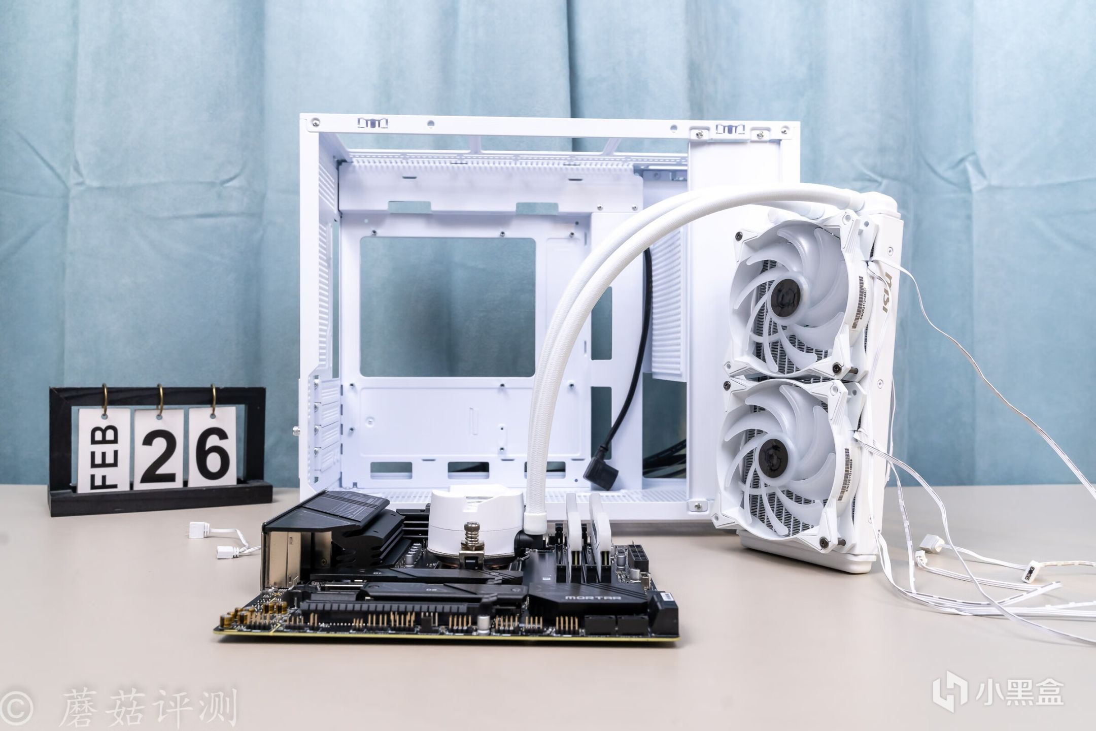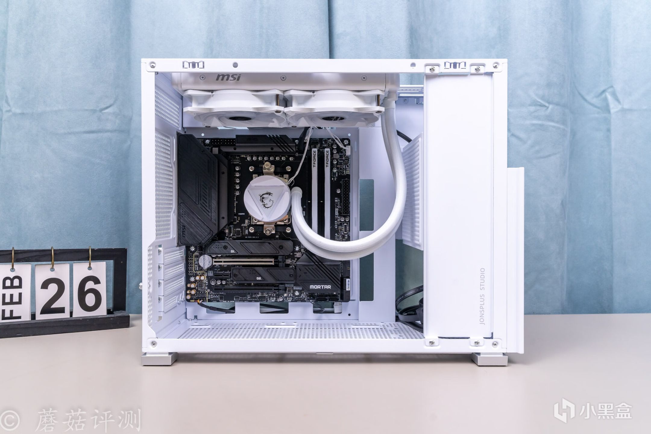 ▼主板輕鬆固定在機箱左側的中部,水冷排輕鬆安裝在機箱的頂部,水冷排距離主板的上部的空間還是非常充裕的,安裝兼容性的表現非常不錯。