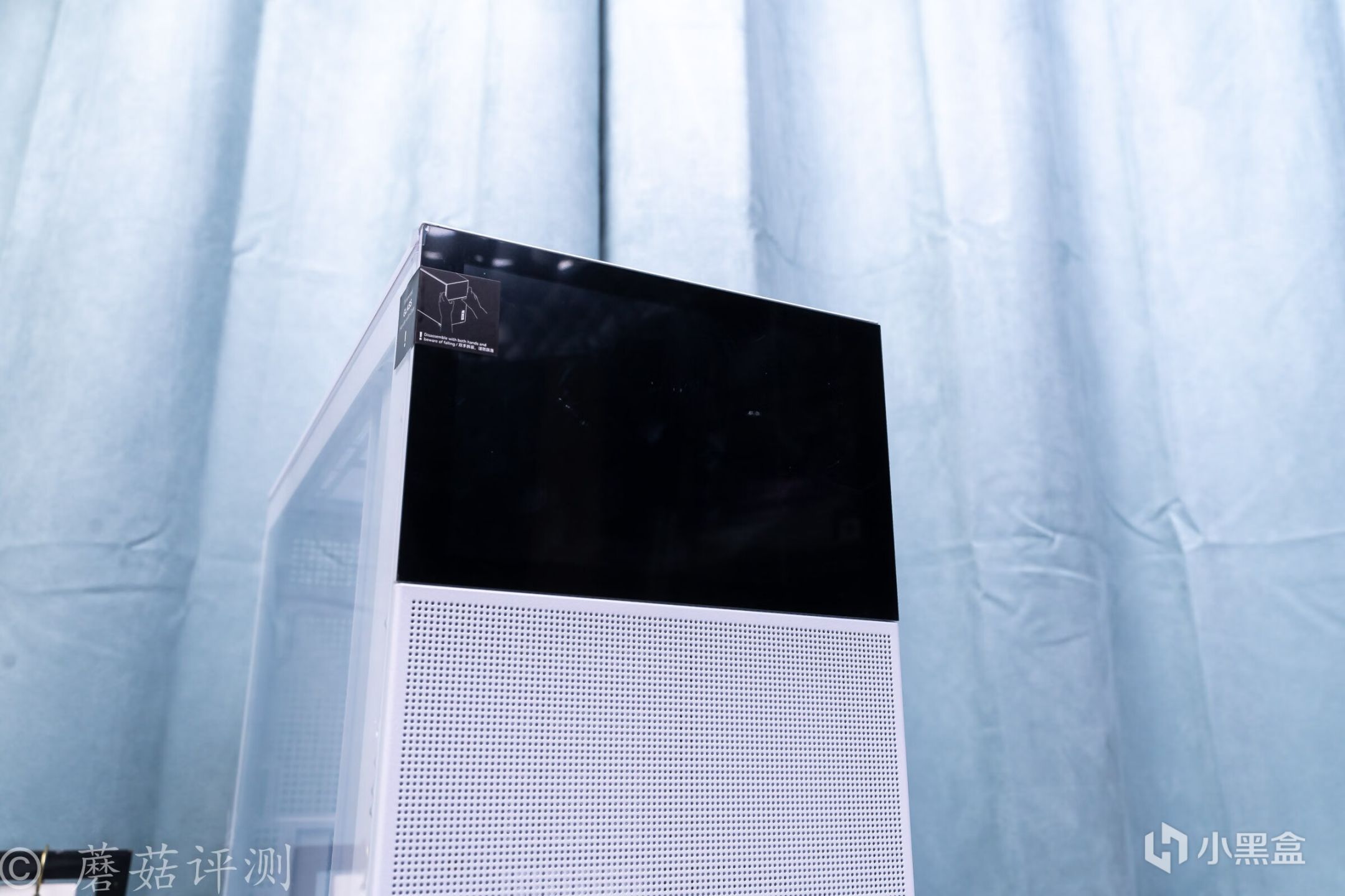 ▼機箱的頂部有熟悉的加高設計,方便左側安放一個電源延長線的接口,同時方便在機箱的頂部安裝固定水冷排。