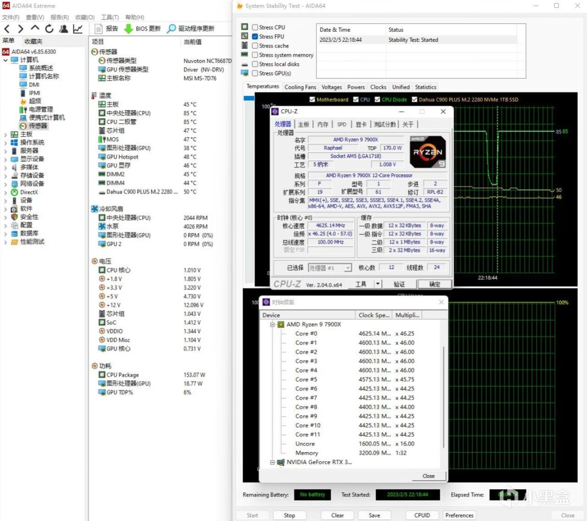 ▼單烤FPU測試,處理器功耗160W左右,頻率在4.7GHz左右,溫度85℃,固態硬盤溫度50℃。