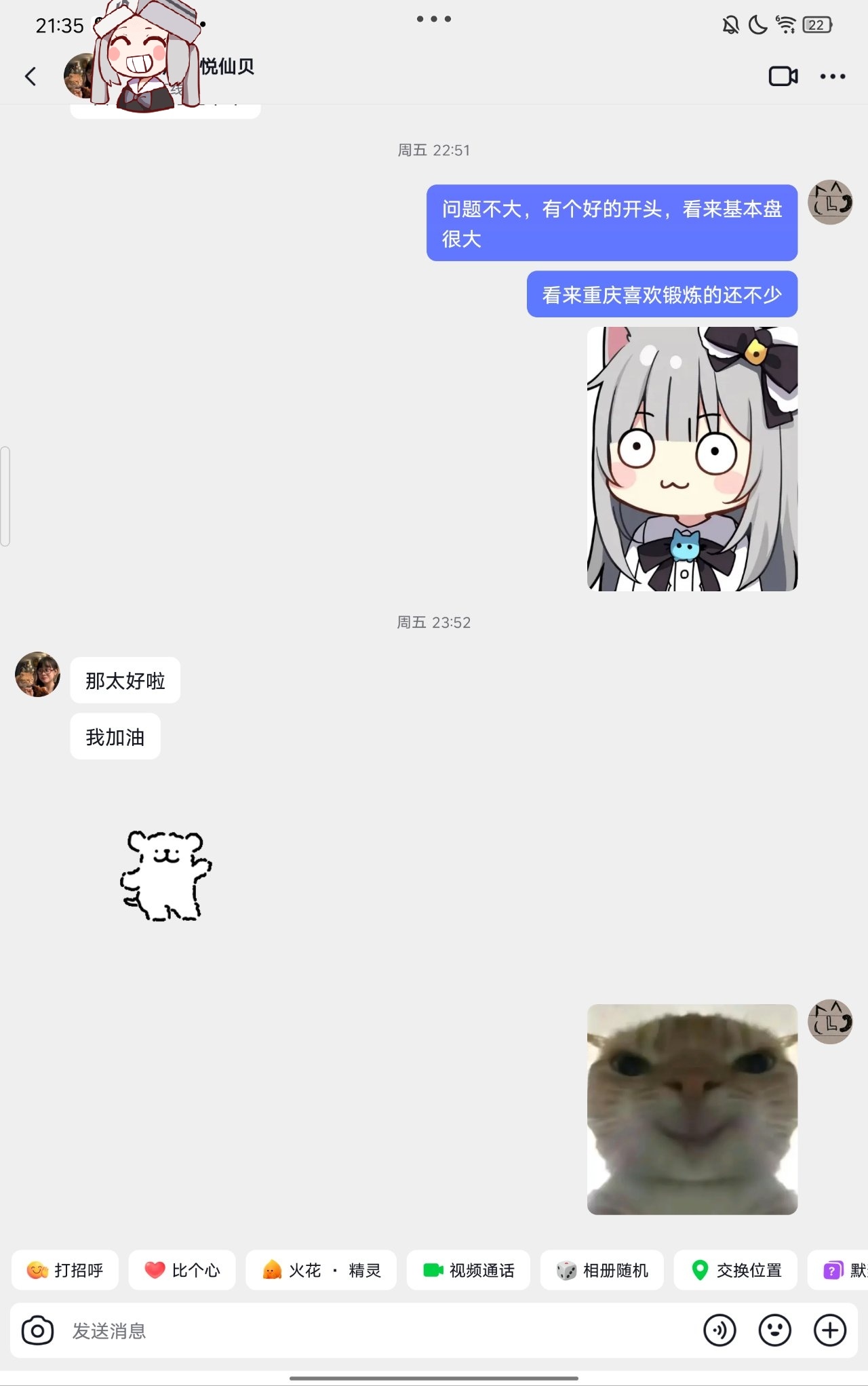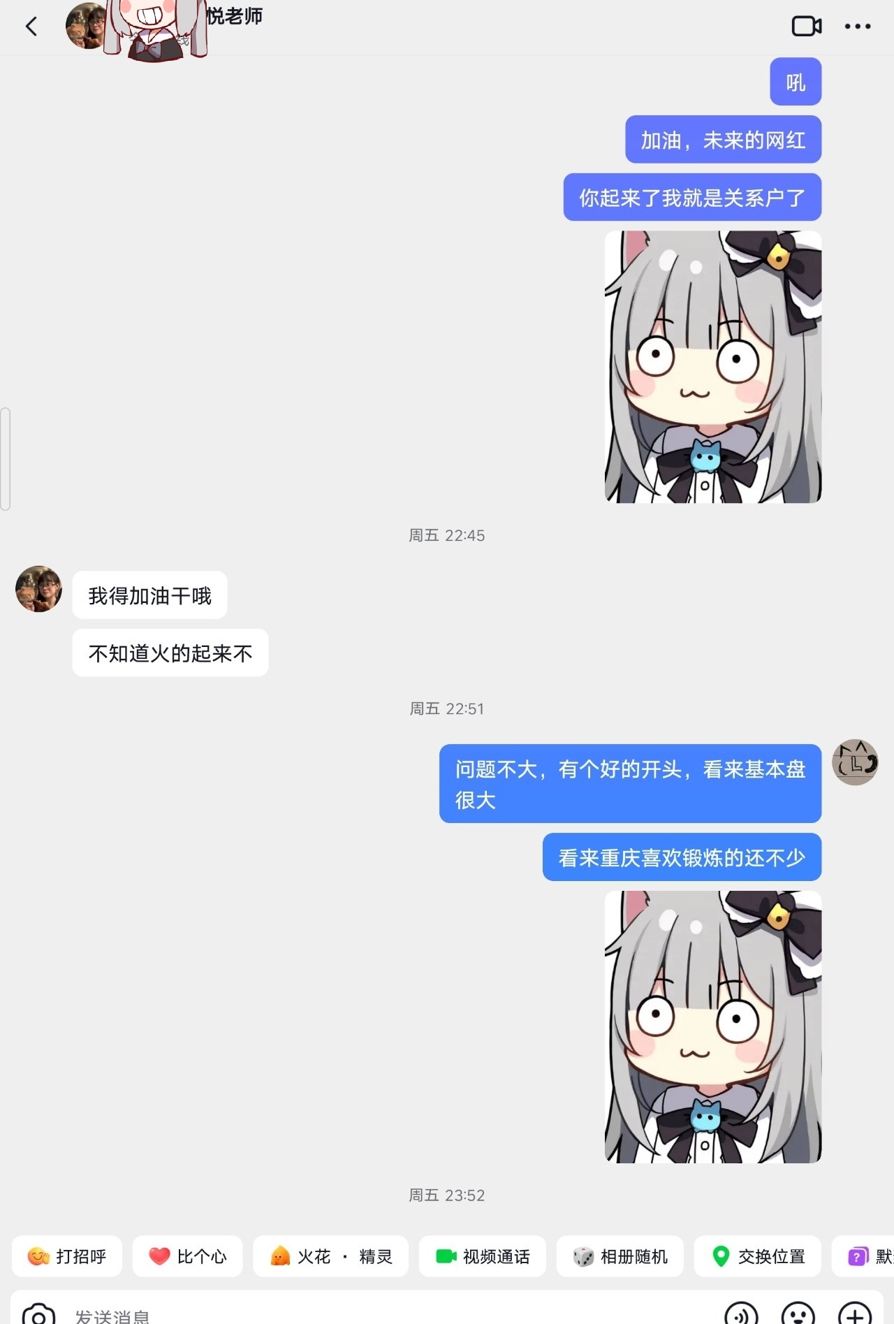 猫跟老师说你带我练腿,前辈说要去化妆,没想到这么优秀的人也有容貌焦虑,她素颜很好看,那我就借此鼓励她,我就说你素颜本来就好看,你教教我好不好,她一高兴就手把手教了我很多器械。我练的时候还想着怎么夸夸她,她太好了,他需要更多的鼓励与支持,好看的皮囊千篇一律,但是她有这很多人羡慕不来的澎湃生命力和健康的身体