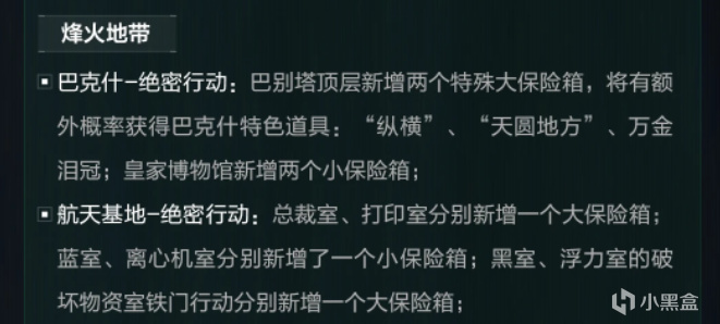 開局六分鐘,地圖左上角教堂中會起火,玩家避開火焰後可以喫到其中新增的三個小保險,然後全圖會起濃煙,能見度直線下降,意味着狙仔會變少。