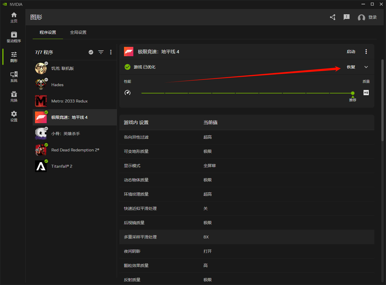 步驟:關閉後在圖形中——程序設置裏——找到被優化的遊戲點擊恢復即可還原到之前的設置。